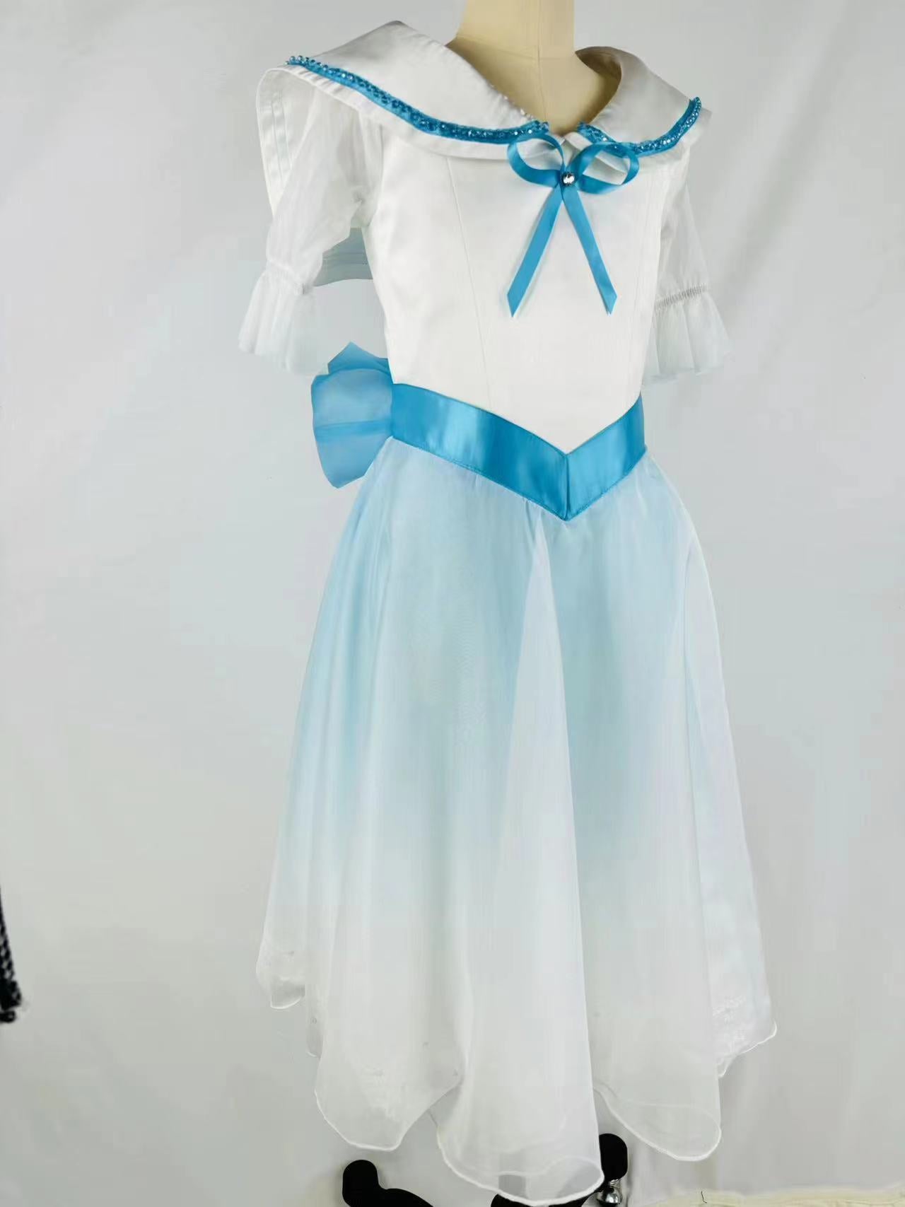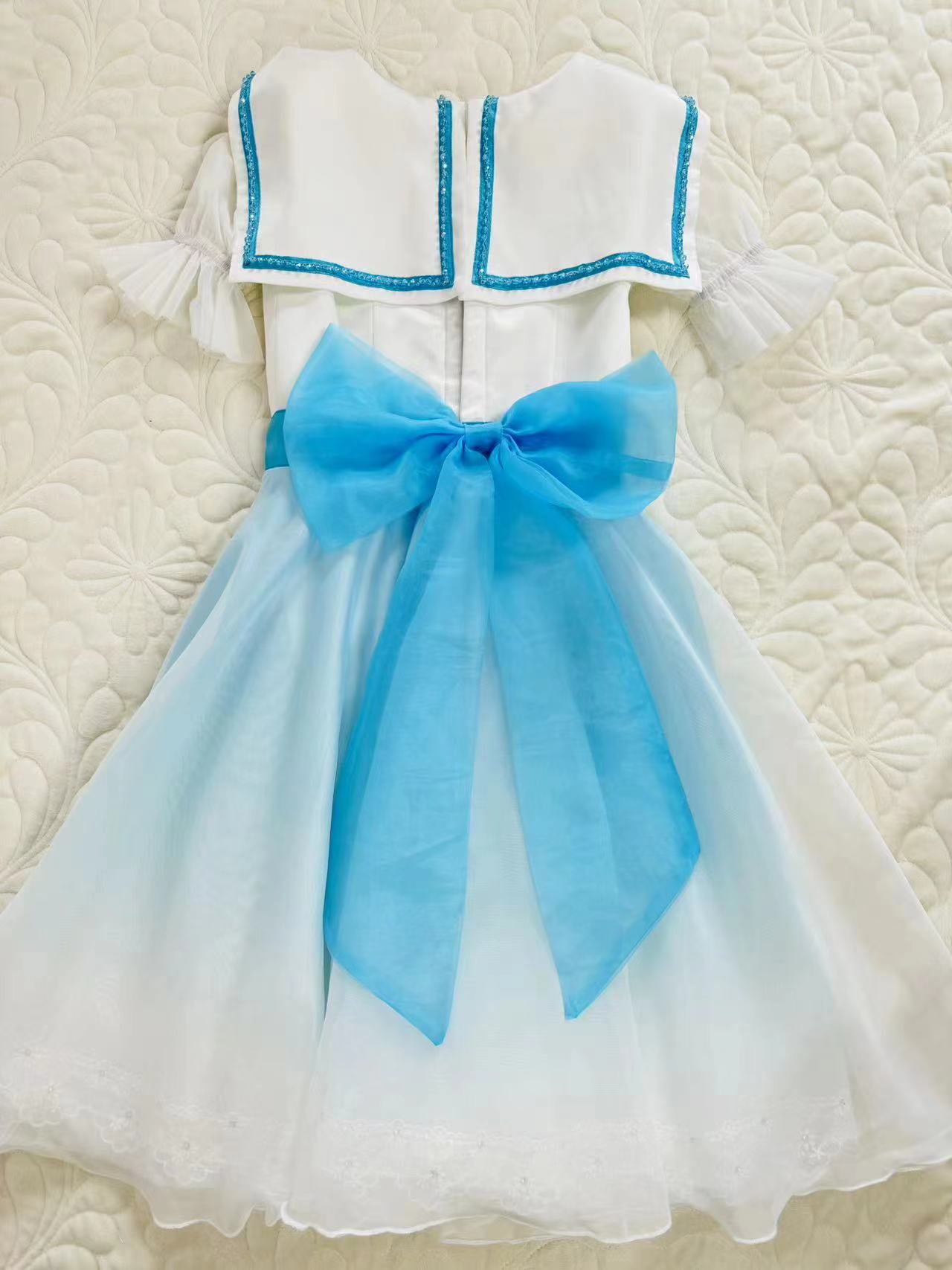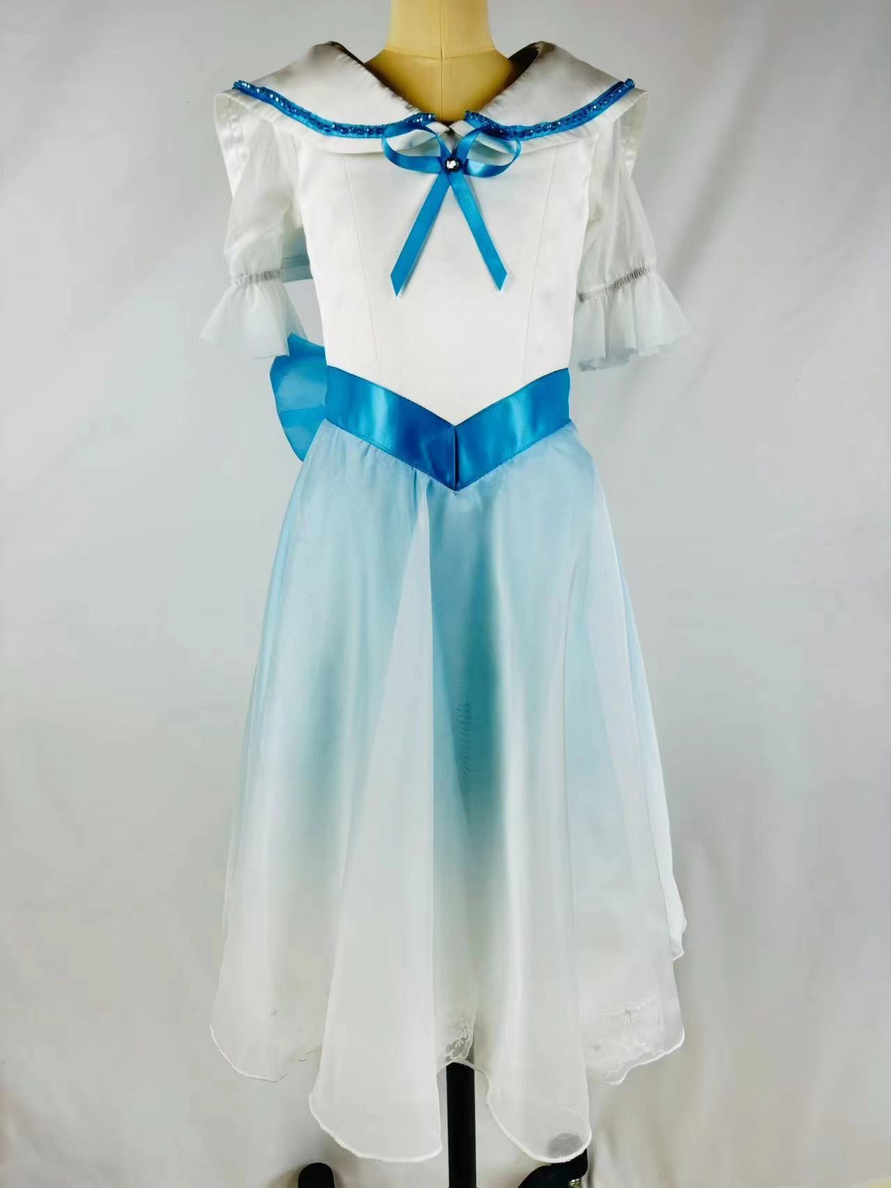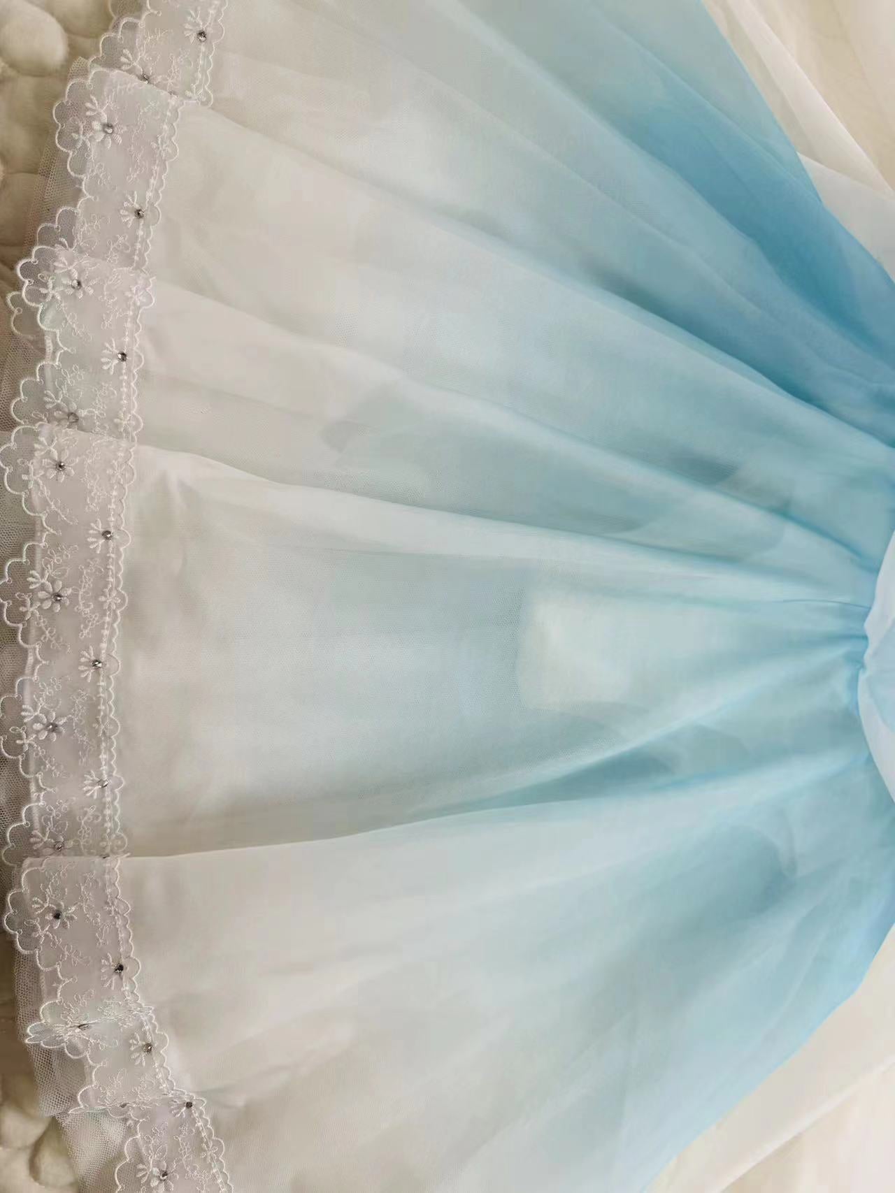 White top with three-quarter sleeves, round neck and wide collar decorated with bright blue trims and ribbons. Wide blue sash tying in the back with a big bow. The rest of the dress is made with ombre' dyed organza, showing gradient shades of blue fading to white. The edges of the dress are decorated with white lace.