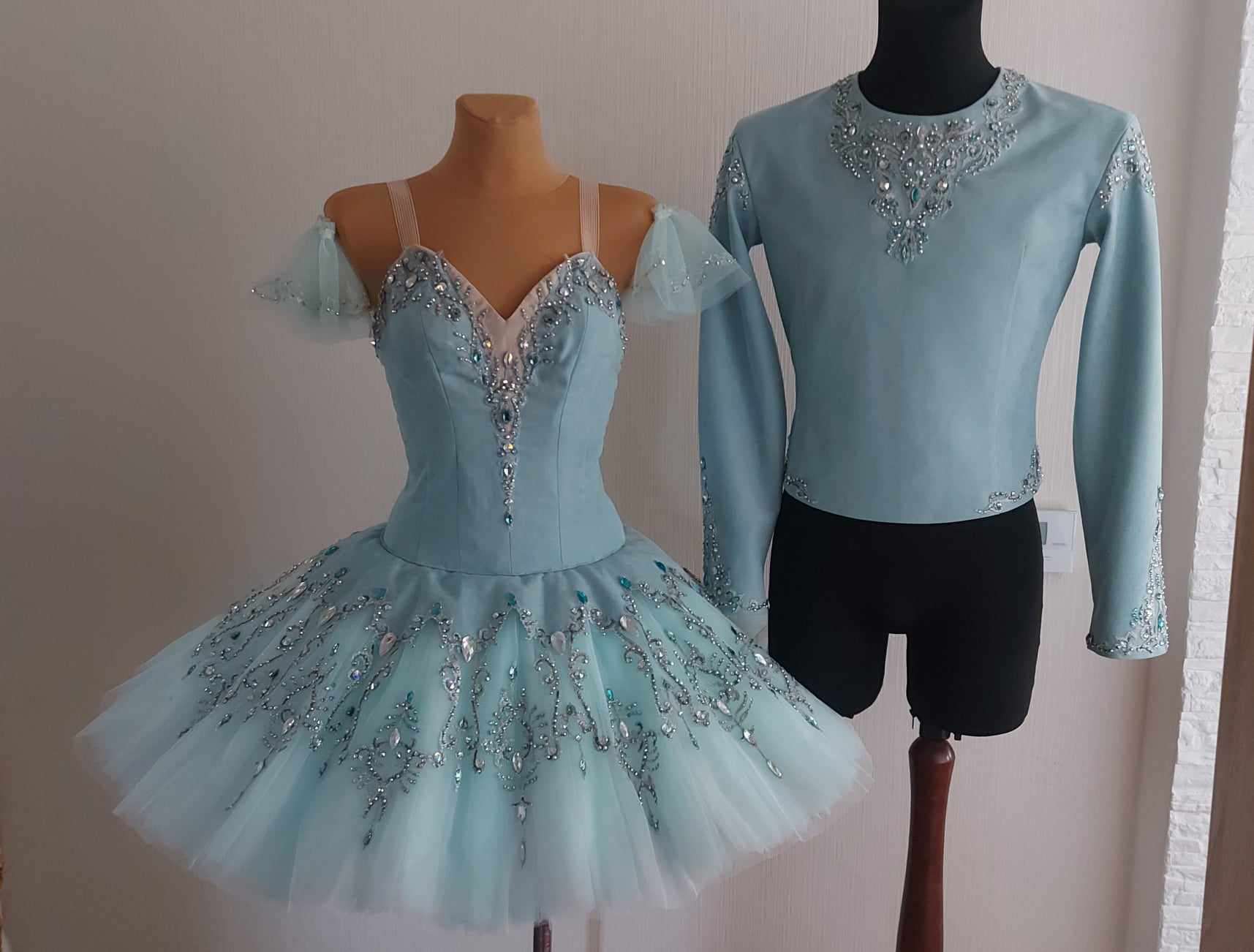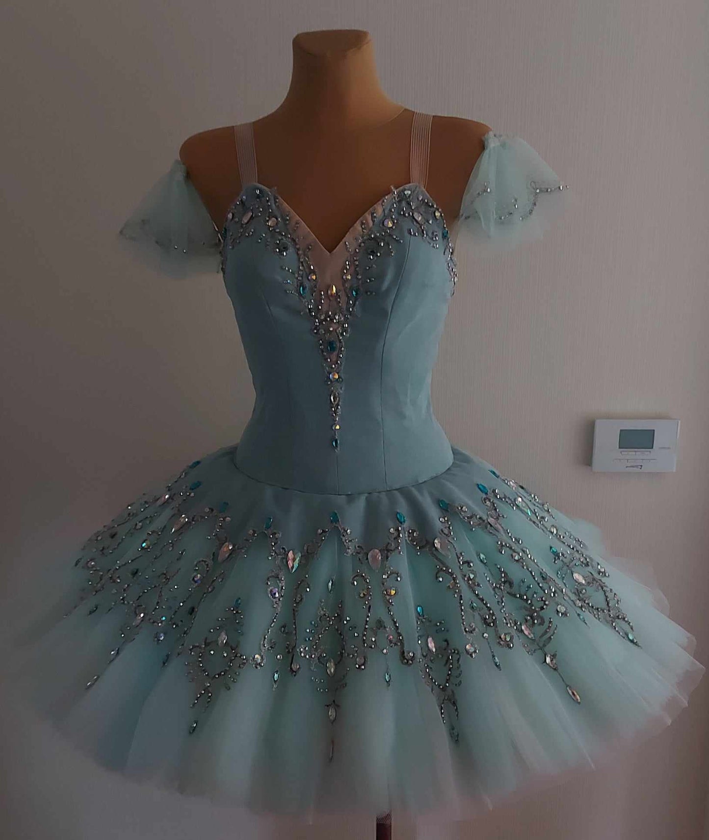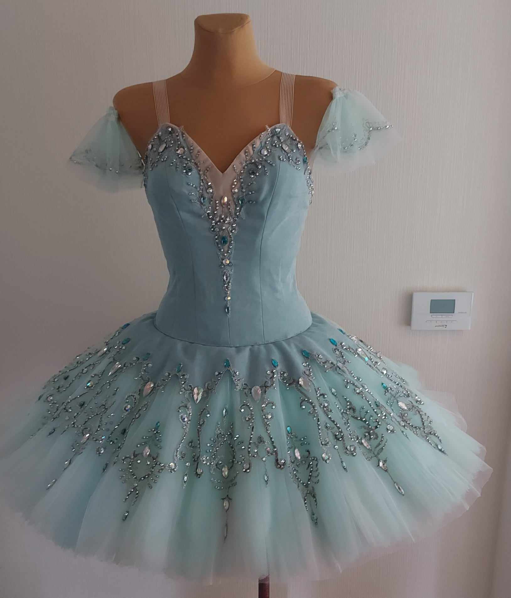 The female professional tutu is made in a wonderful shade of aqua pale blue. The fitted bodice is created with a special semi stretchy fabric and features rich silver decorations, crystals, pearls and appliques. Deep V cut with mesh insert and hooks and eyes closure in the back. Matching arm bands included. The bell shaped, professional tutu skirt has ten layers of graded tulle and has been hand embroidered and decorated with silver sparkling appliques, crystals and trims, for an extremely shiny effect on stage.