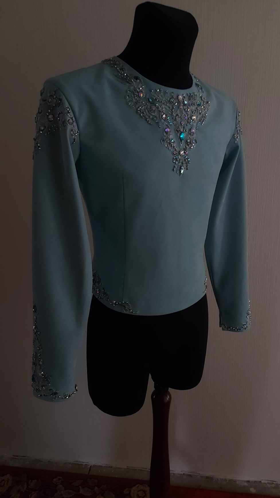 The professional male top for Solor has been entirely hand made, using a special semi stretchy, pale aqua blue fabric. Round neck and long sleeves. The neck area of the tunic has been richly decorated with silver appliques and crystals, as well as the edges of the sleeves. Hooks and eyes closure.