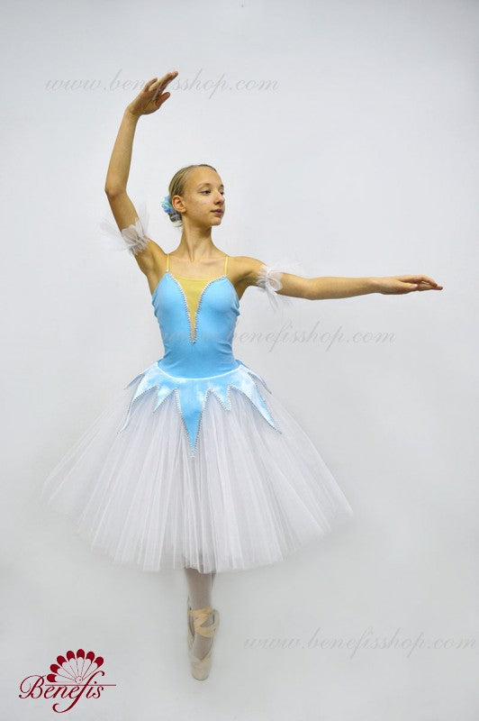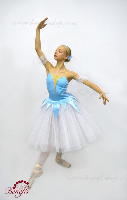 The sky blue bodice is made of elastic fabric, while the blue tutu skirt is made with sky blue velvet. The tutu features a deep V neck, with a flesh-colored insert on the chest.