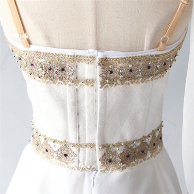 This professional costume features a beautiful top made of crepe fabric, with square neck and rich gold decoration on the top, central and waist area. A white chiffon scarf is attached to one of the nude straps. The two layered white, chiffon skirt features two different lengths.