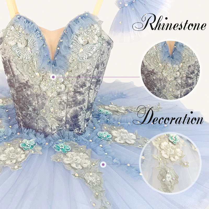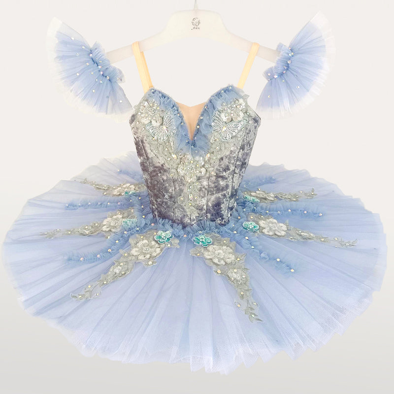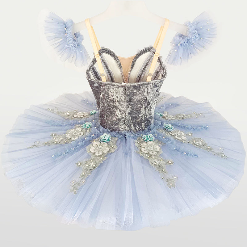 The bodice is made with grey shiny brocade, and features silver appliques, crystals, blue tulle frills on the V neck a nude insert, as well as hooks and eyes closure. Blue tulle arm bands are included.