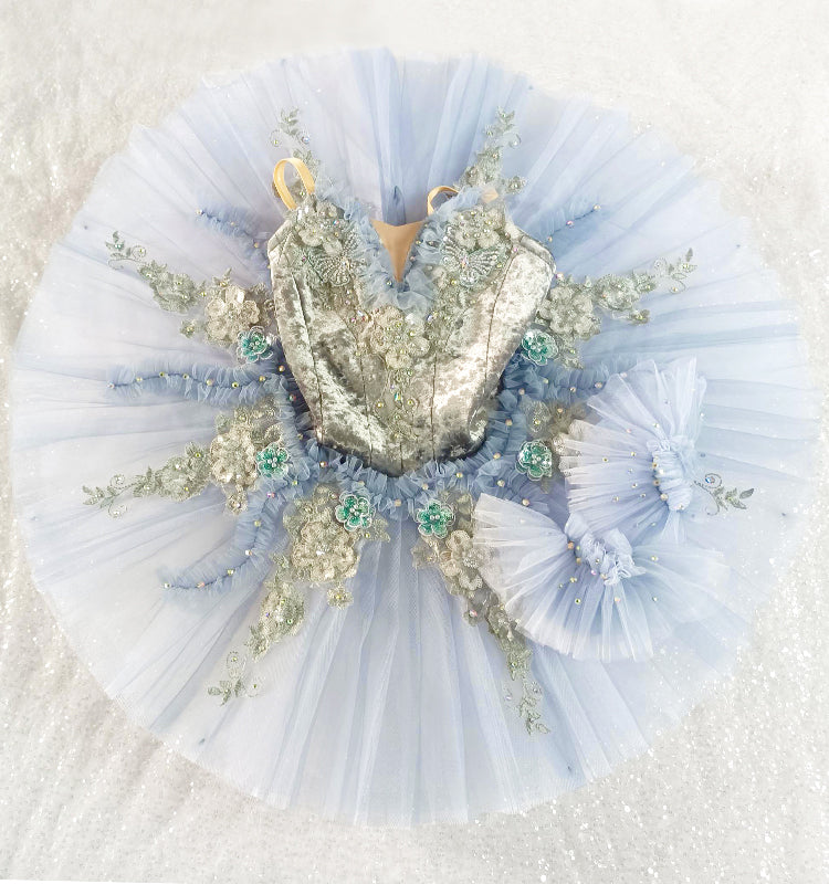 The platter, ten layers tutu skirt is white, with a top layer of pale blue tulle. The tutu skirt has been richly decorated with grey and blue flower appliques, and crystals.