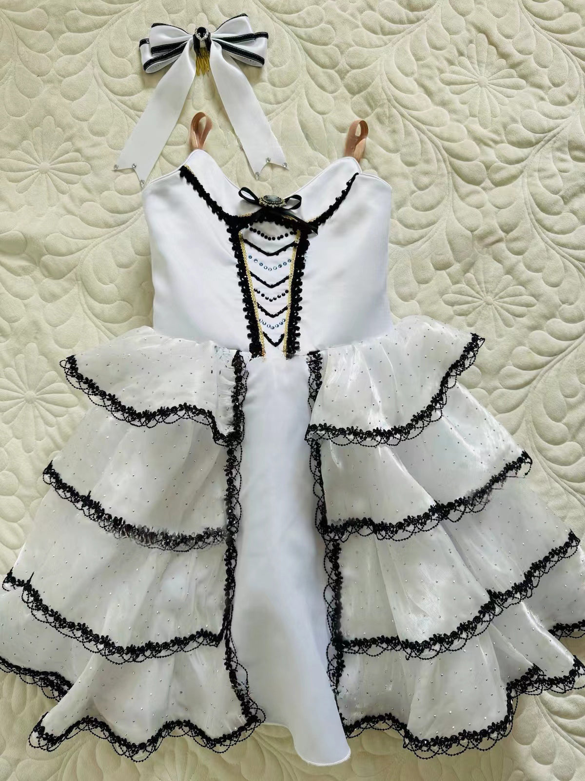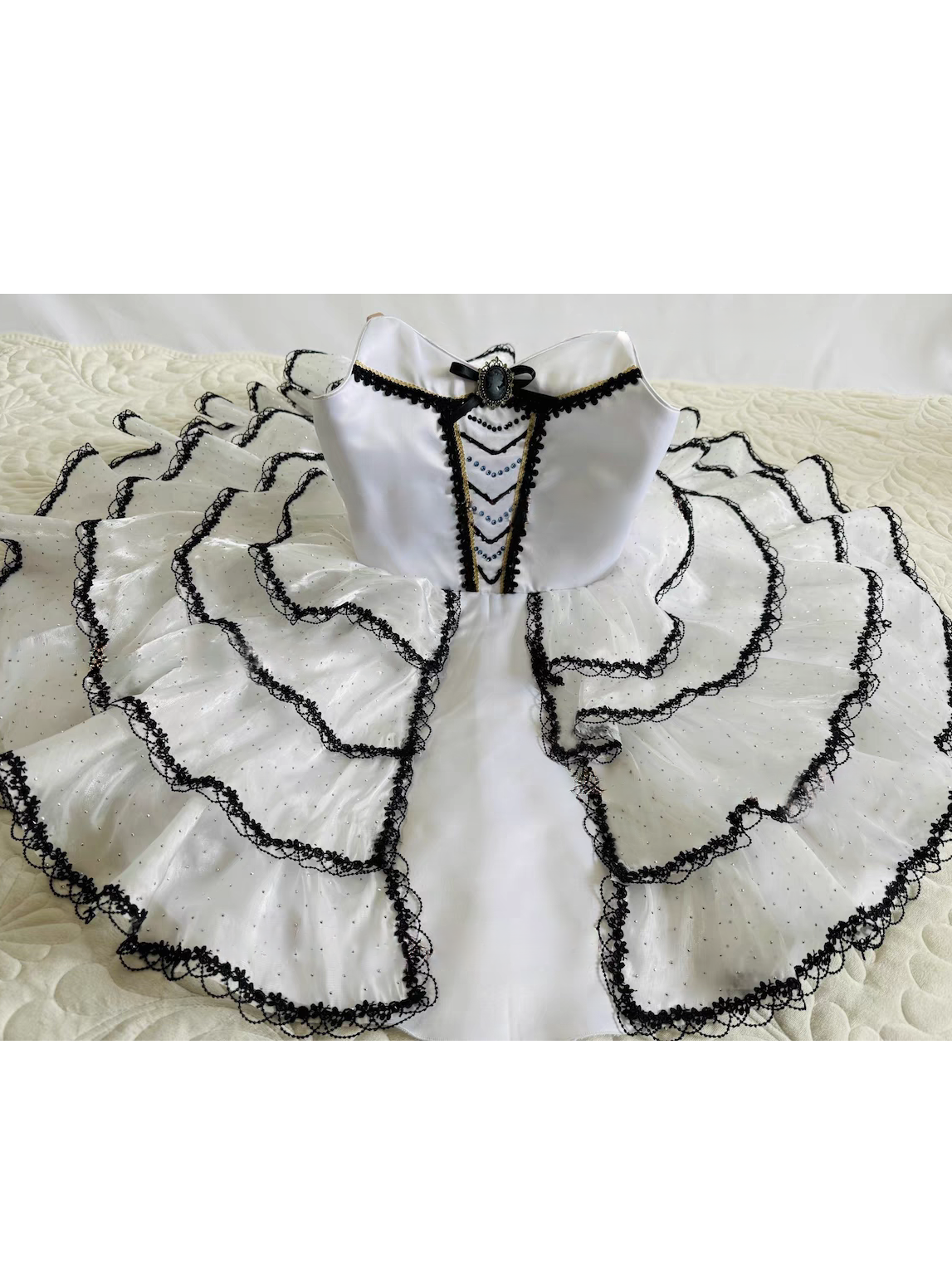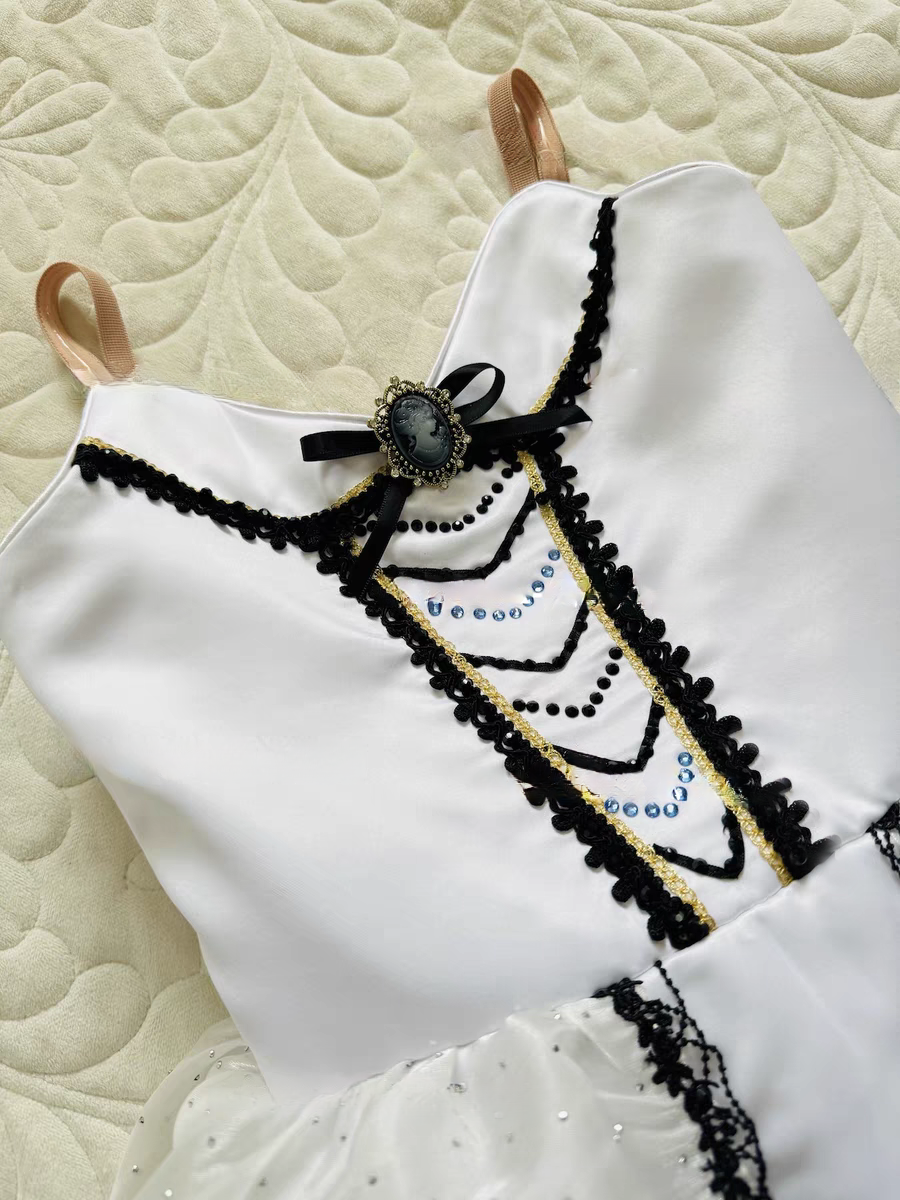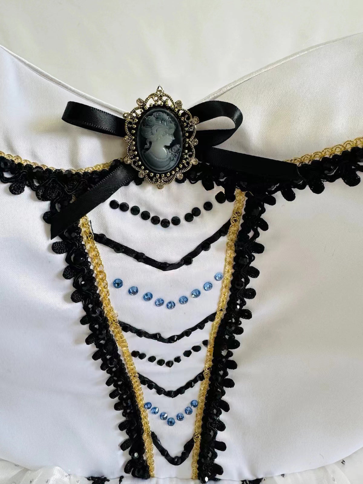 White, semi stretchy bodice with round neck, black trims and sequins decorations, as well as a pretty back bow in the middle of the chest, with vintage brooch attached.