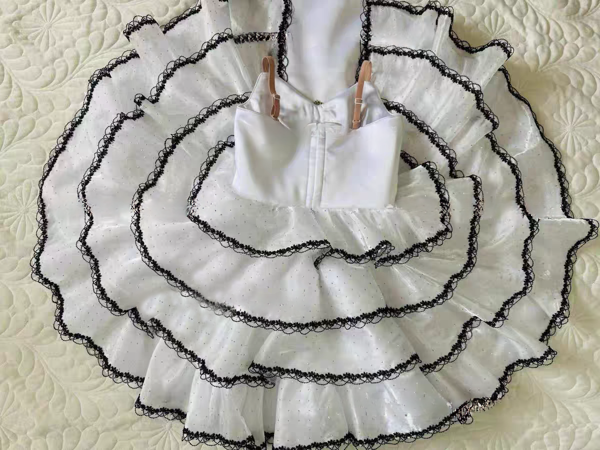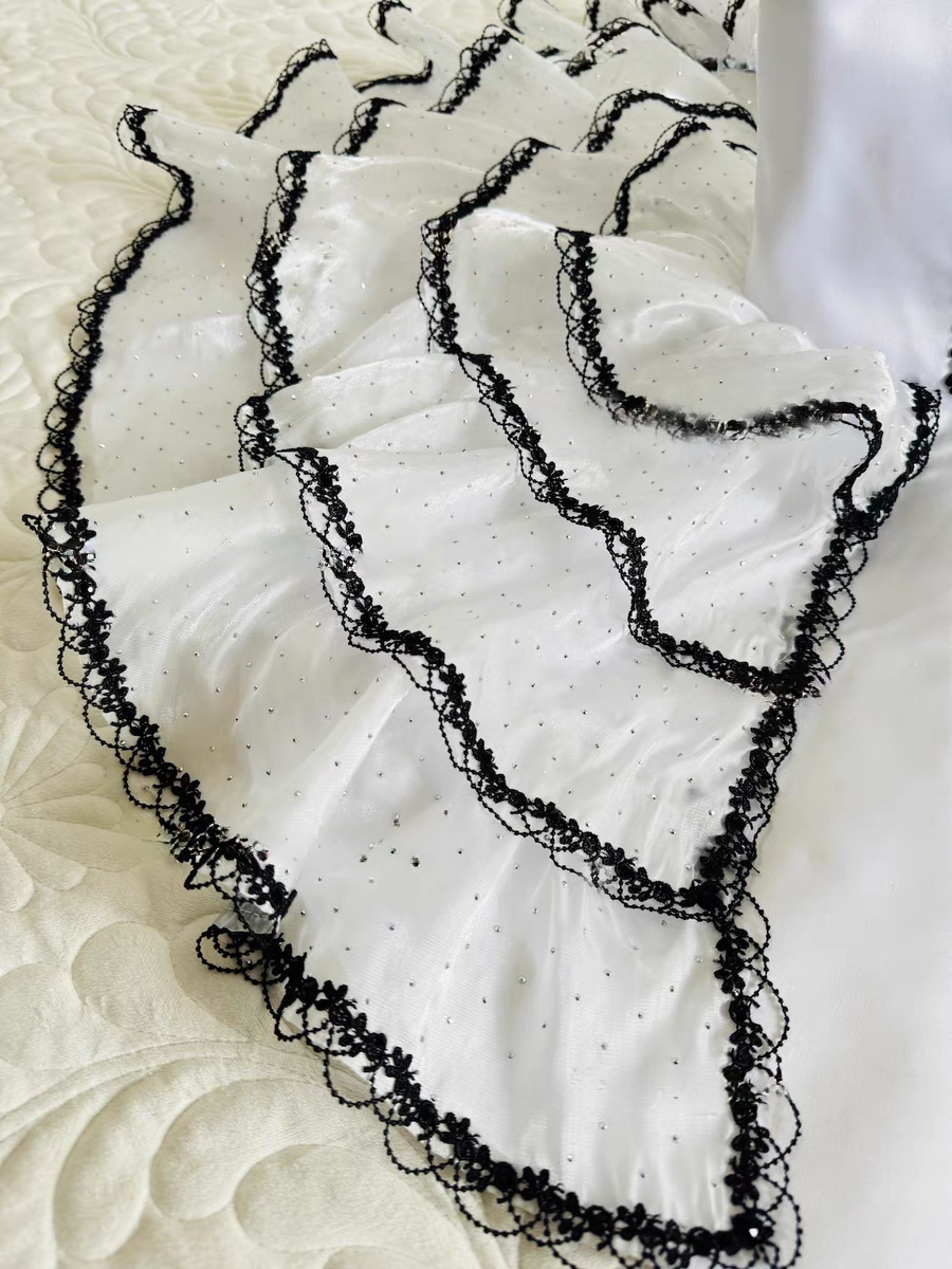 White, Romantic organza skirt featuring four layers of ruffles with black trims at the end.