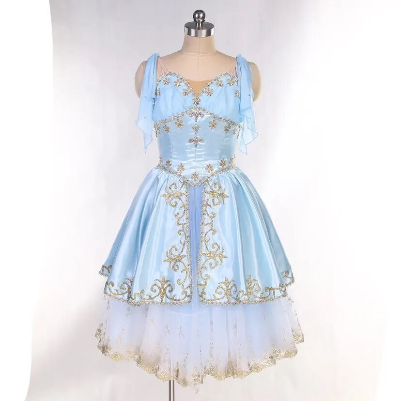 The Romantic tutu skirt is created with pale blue tulle, decorated in gold on the edges. There is a beautiful blue satin overlay, also richly decorated in gold, opening in the center.