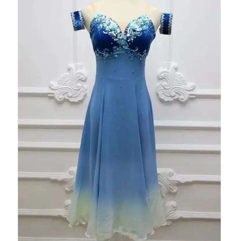 The chiffon dress is made with high quality chiffon which has been hand dyed. The top of the dress is sky blue, fading to pale blue and white towards the edges.