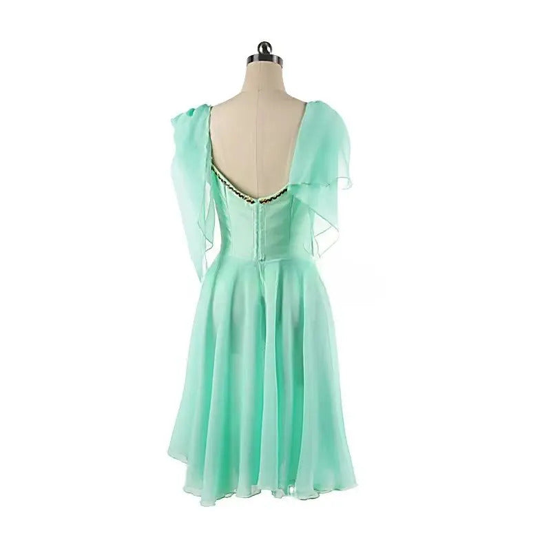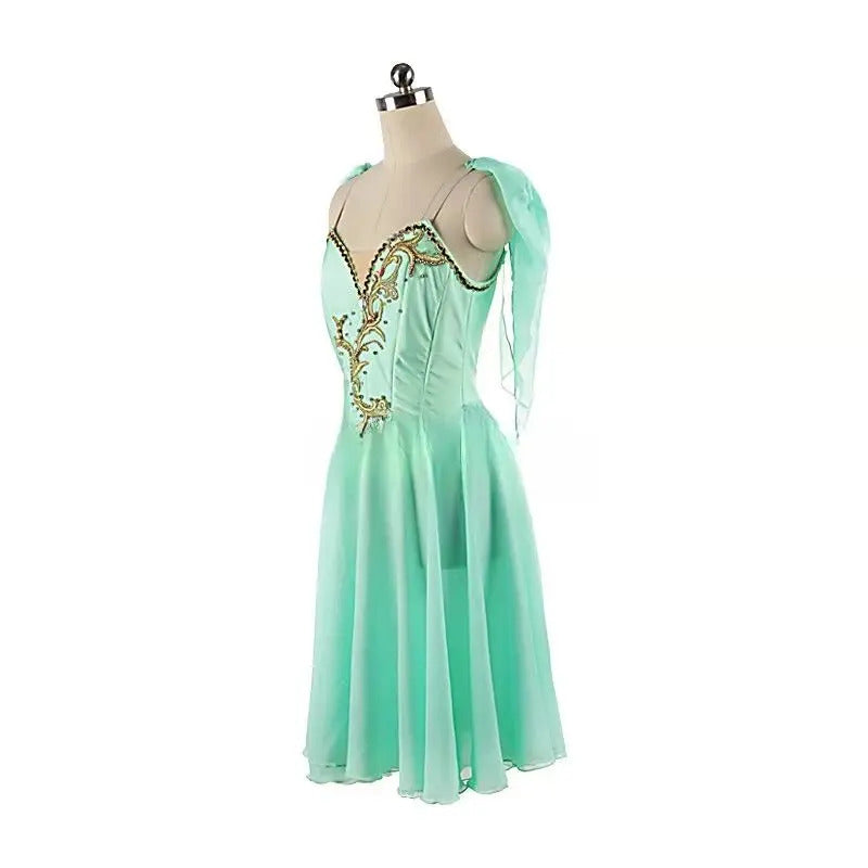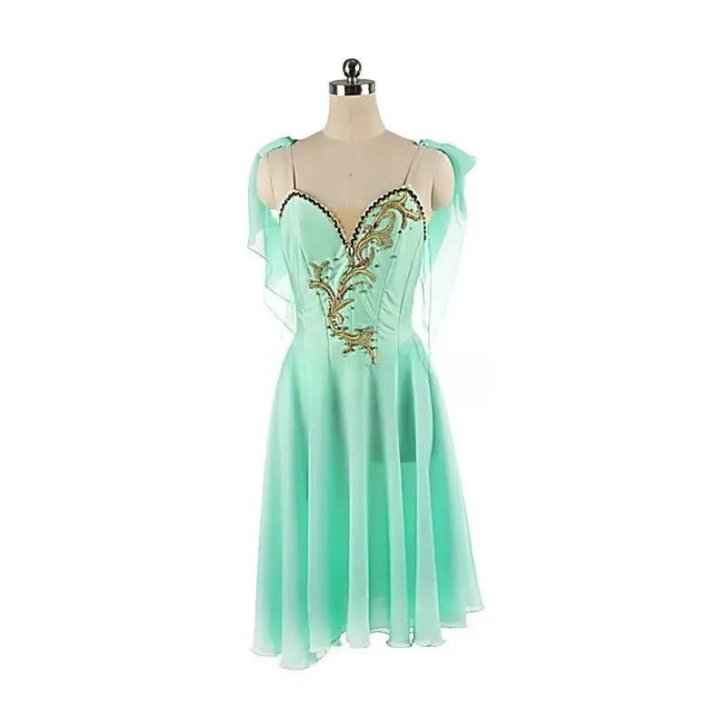 New creation for the role of Cupid. This mint green chiffon professional ballet dress features a V-shaped bodice with hooks and eyes closure. Rich gold decoration with appliques and crystals. Two mint chiffon scarves are attached to each shoulder.
