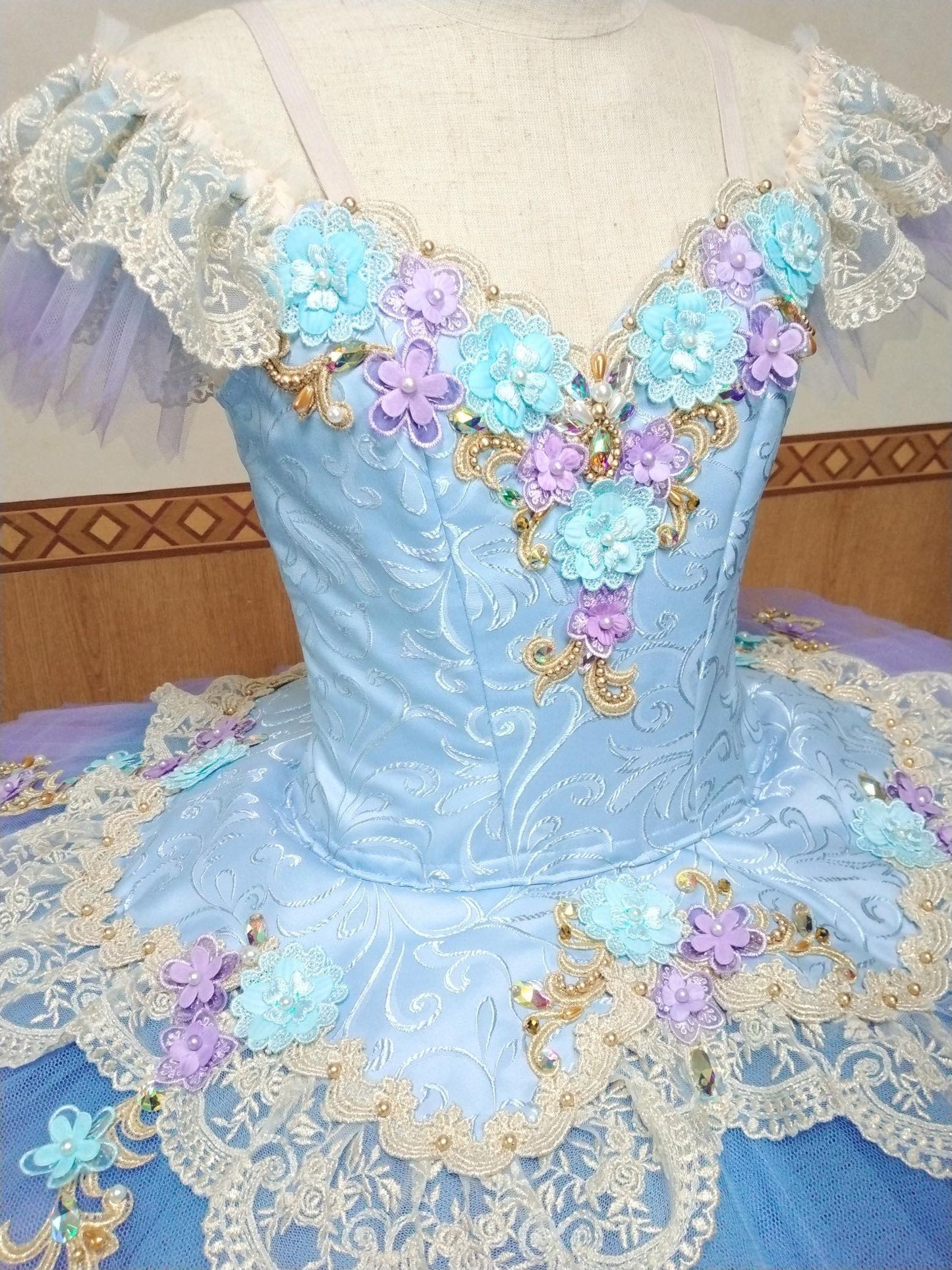 The professional, 10 layers tutu skirt features two colors: sky blue and lilac, with a flower shaped tutu skirt decorated with silk flowers, lace and sparkles. The rest of the skirt features rich embellishments in silver and sparkles all around. The top layer has been ombre' dyed with graded tones of blue.
