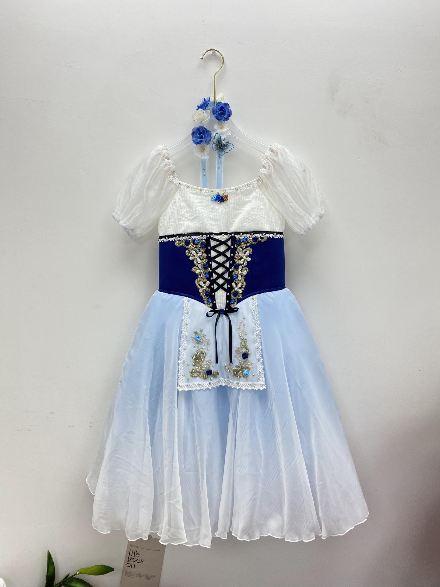 The professional bodice is deep blue, and created in the classical peasant style suitable for ballets such as Giselle, La Fille Mal Gardee, Coppelia, Napoli, La Vivandiere, Flower Festival in Genzano etc.
