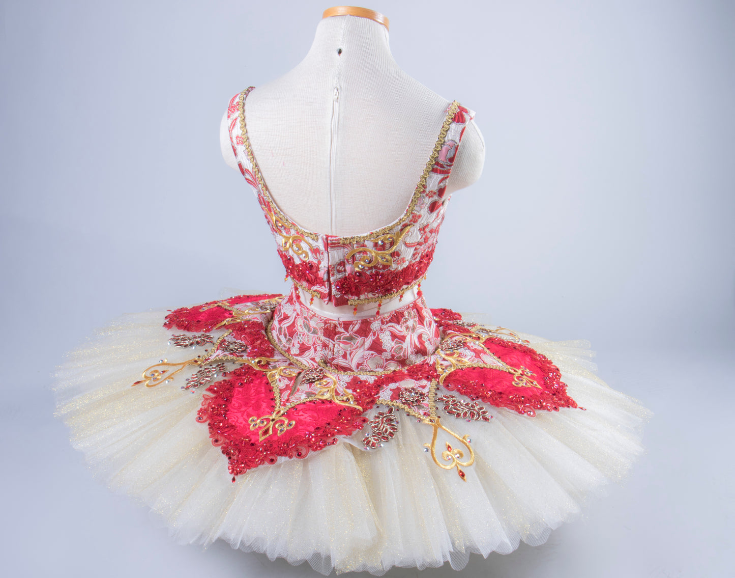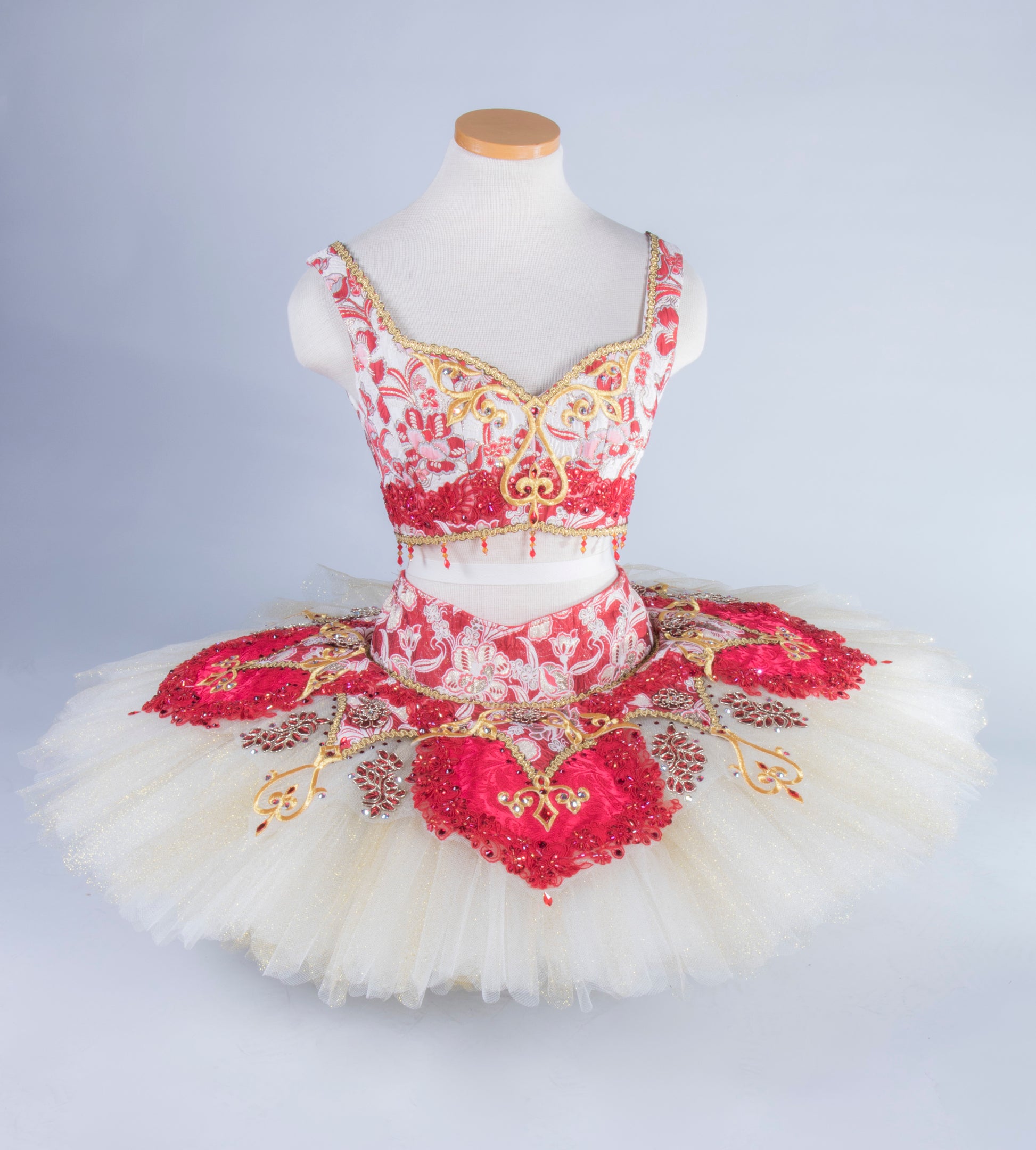 The brocade we have used for the bra top and for the skirt's belt and decorations is a mix of red, ivory and a soft gold in a rich pattern suited for these characters. The plate is embellished with gold trim and a contrasting red jacquard and beautiful appliques in gold, black and red. The crystals are Swarovski flame cut in bright red and Czech Preciosa in siam, topaz  and garnet AB. The tutu is ivory and gold glitter tulle every other layer and shimmers under stage lights on top and underneath as it bounces with leaps. Both the bodice and basque on the pants are hand beaded with red and gold AB drop crystals.