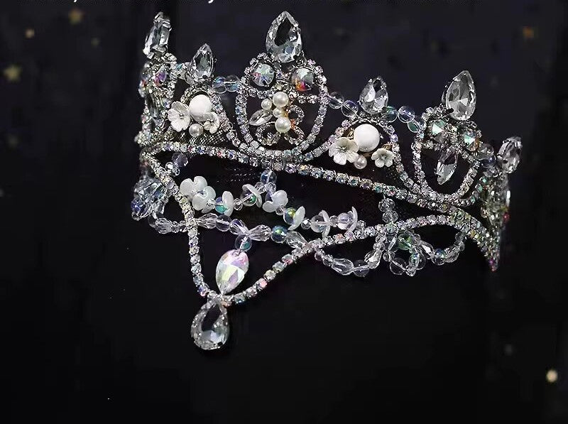 This professional headpiece is made with all sorts of silver beads and white crystals, in different size and shape. It also ends with a front dramatic drop, and rhinestones chain on the side.
