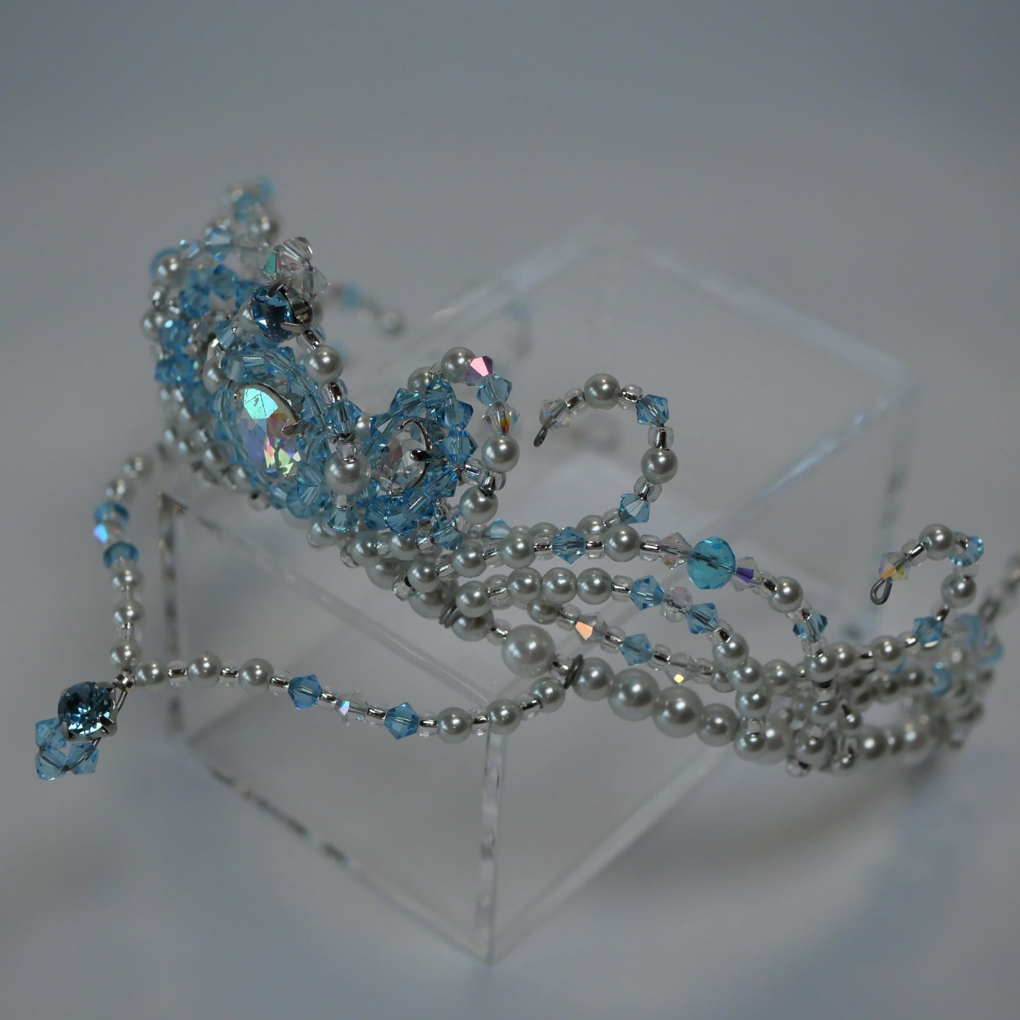 One of our most impressive headpieces! This blue and clear Swarovski professional tiara features pale blue crystals in different shapes and sizes, a silver frame, white pearls, a big central blue stone and a dramatic front drop.
