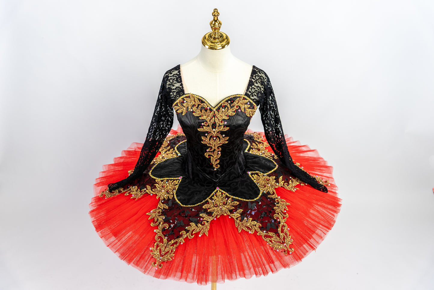 The professional, 10 layers, red tutu skirt has a black overlay and very impressive black lace appliques, with gold decorations.