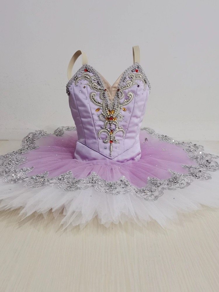 The platter tutu skirt is the highlight of this costume. It features ten layers of ombre' dyed lilac net, fading to white, and creating a wonderful effect of two colors. The top part of the tutu skirt is also richly embellished with silver appliques, pearls and crystals.