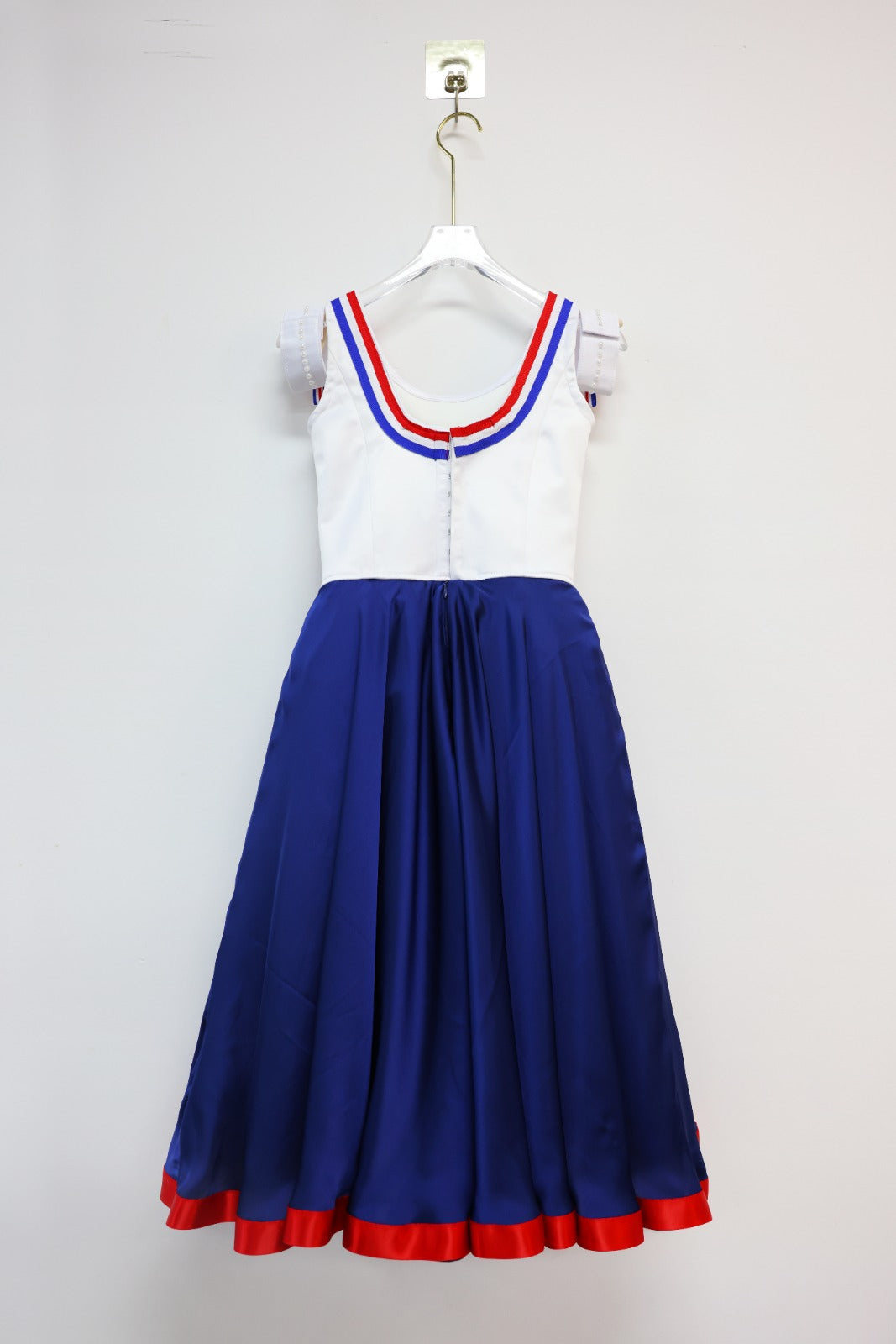It is created for the ballet "The Flames of Paris". The tight fitted bodice is white and has a central big, V shaped pattern, made with blue, red and white ribbons, representing the French flag. A red, white and blue big bow is also decorates the costume's round neck. White arm bracelets with blue and red ribbons are included.
