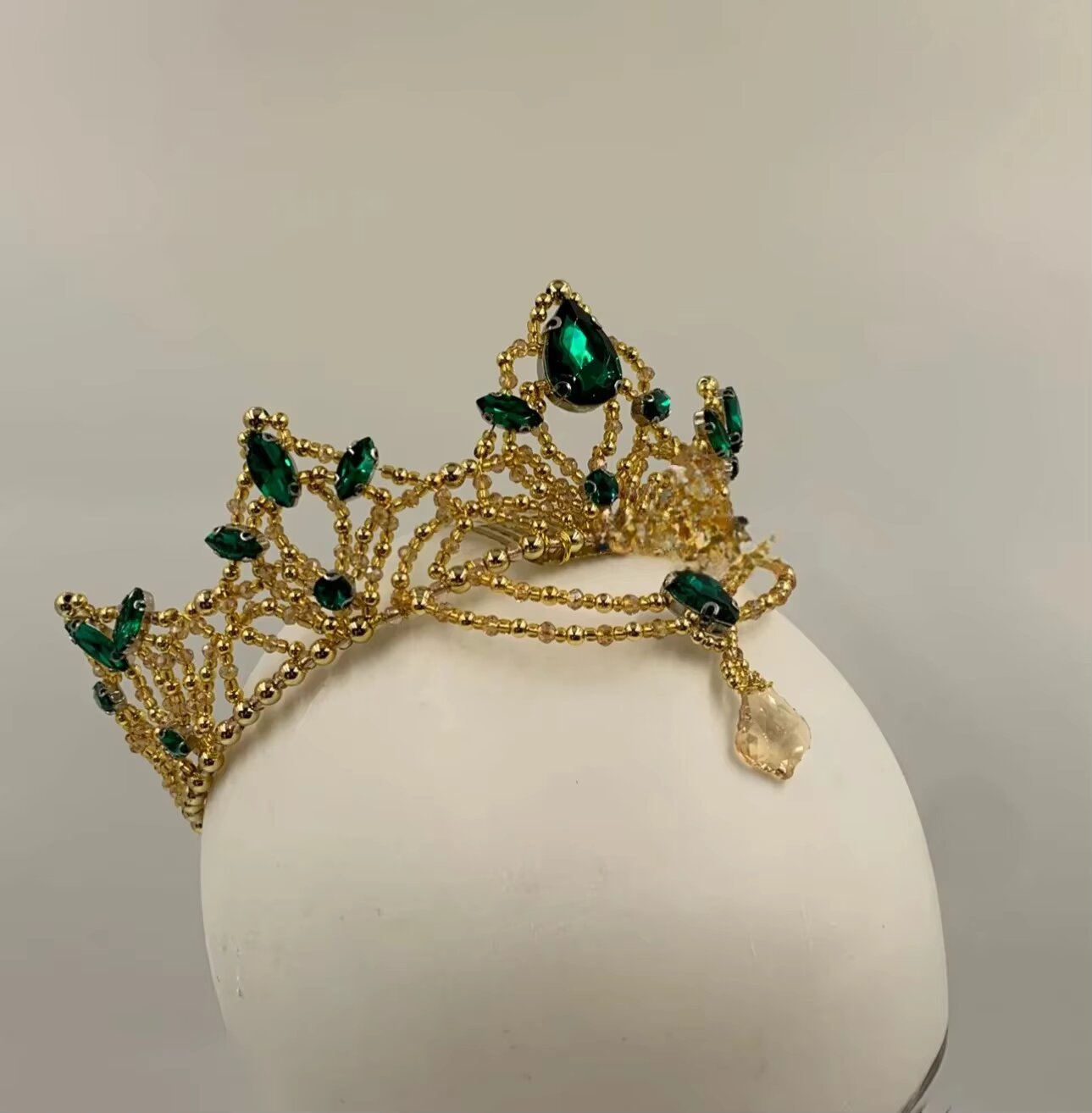 Built on a golden base and entirely hand crafted, this professional tiara features green and golden pearls. Front drop. A must to have when buying any Esmeralda tutu.