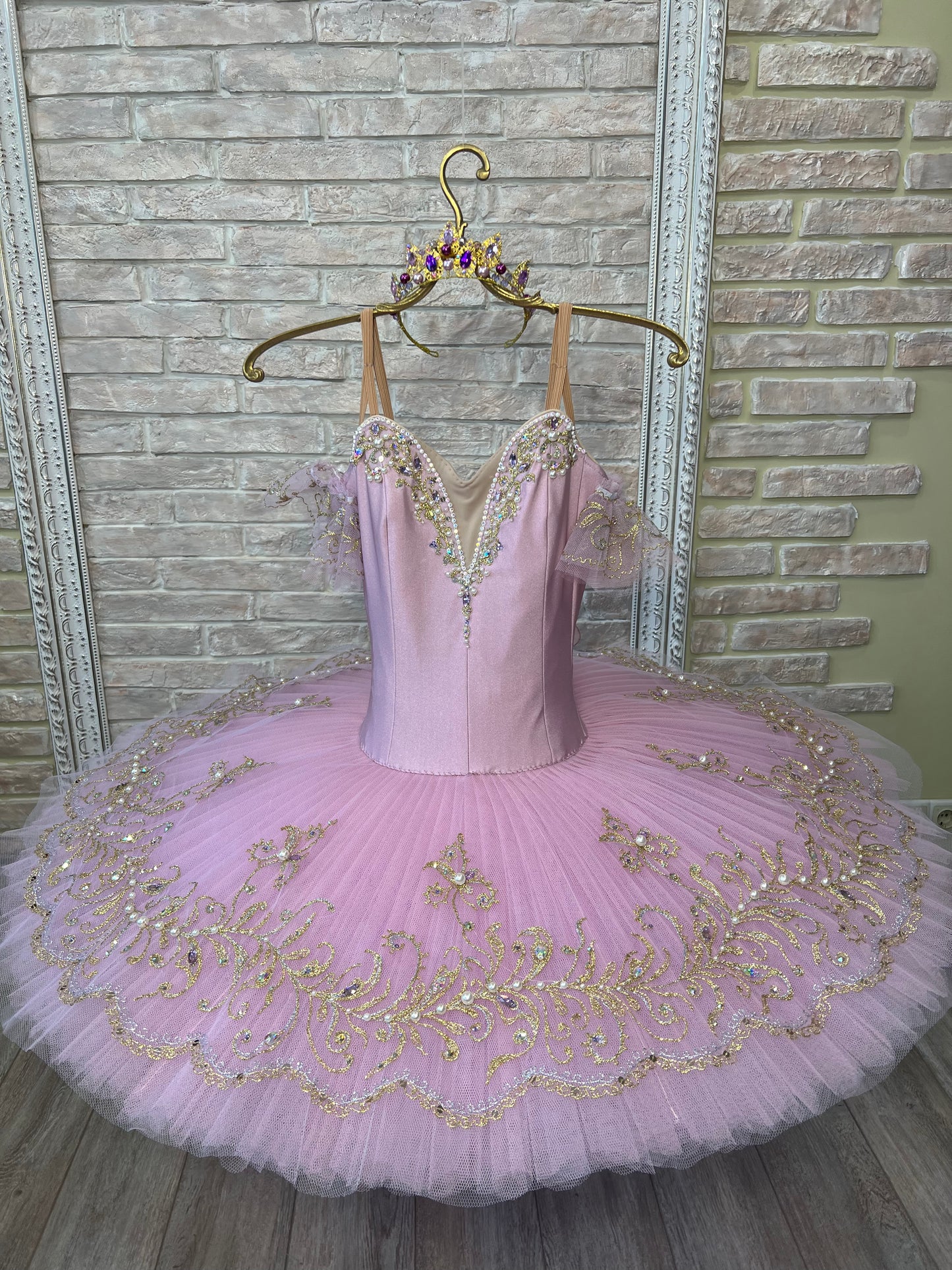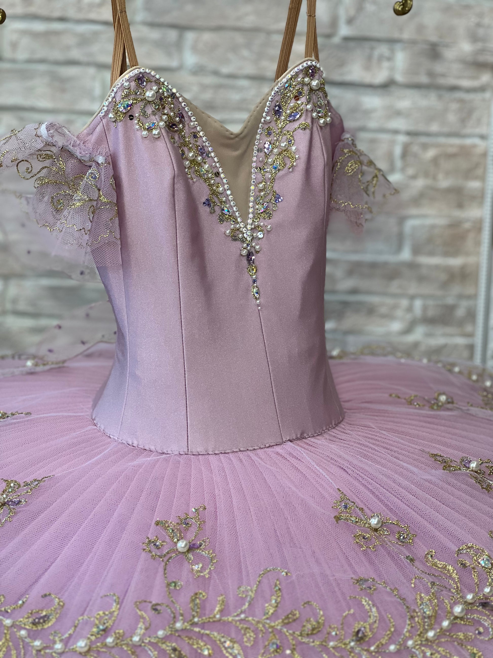 The pale lilac, semi-stretchy bodice has a deep V nude insert, and is decorated with golden appliques, white pearls, sequins and rhinestones. The 10 layers, professional hooped tutu skirt is made with high quality lilac tulle, and features one of the richest decoration, with rhinestones, white pearls and gold appliques and trims. embellishments.