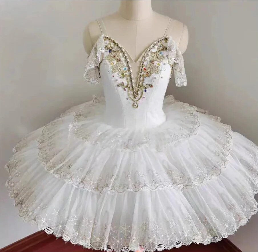 Youth competition or performance white tutu. Custom made one-piece bell-shaped tutu for Aurora, Paquita, Don Quixote, Raymonda, Corsaire and more. Bodice made with white brocade, and richly decorated with gold appliques and crystals. Lace cap sleeves attached to the nude straps.