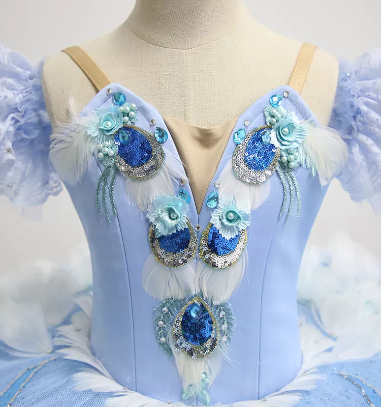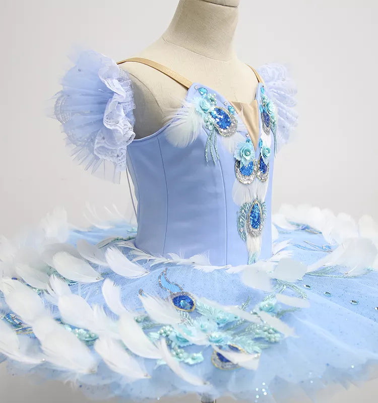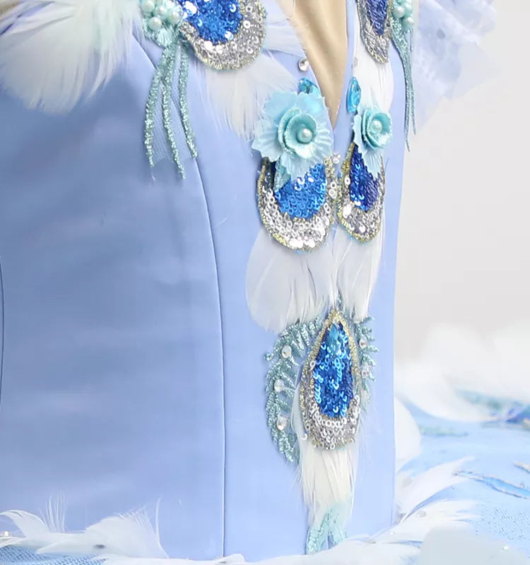 The color is a delightful pale sky blue, with rich feather decoration on the tutu skirt.