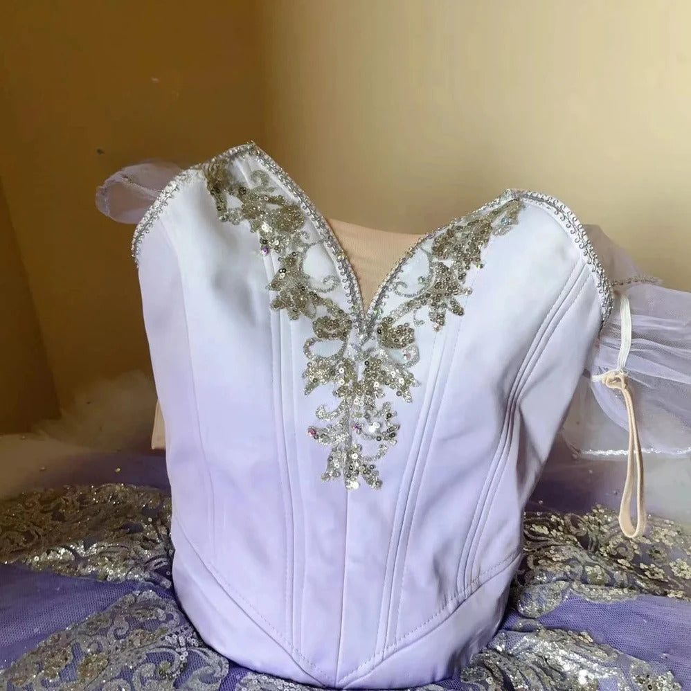 The 12 layers, professional tutu skirt is a real masterpiece. It features the ombre' graded color, starting in deep lilac and ending in white. All the tutu layers are pleated and tacked together. The decorations on the skirt are similar to the ones on the bodice,. Multiple silver appliques have been sewn around the skirt, as well as hundreds of tiny crystals have been sewn on the skirt.