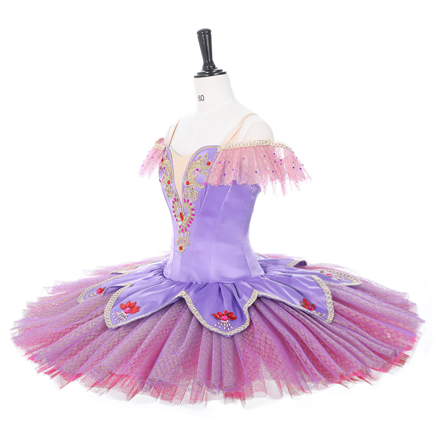 The pancake, 10 layers tutu skirt is rose pink, and features a satin lilac pink tutu skirt, shaped as flower petals. The tutu skirt is decorated with golden trims and crystals.