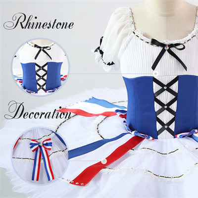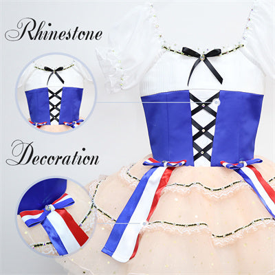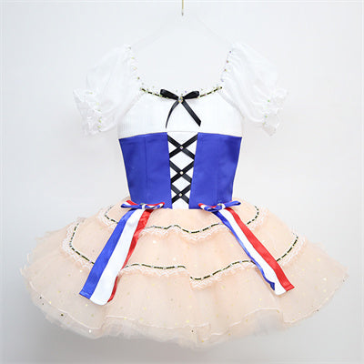 "Young Flames of Paris" is a tutu belonging to our children professional collection "Ballerina", and to the Pre-Professional Collection. The bodice is created blue satin, with a white undershirt and black laced pattern. White balloon sleeves. The decoration on the tutu skirt are made with red and blue ribbons, reproducing the colors of the French flag. The tulle skirt can be made in pale pink or in white.