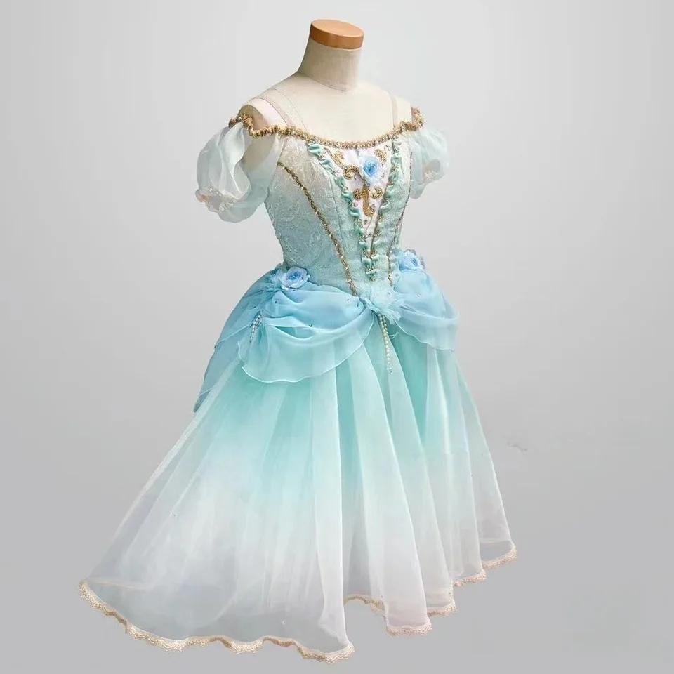 This professional stage costume has been hand dyed with gradient tones of pale aqua blue.