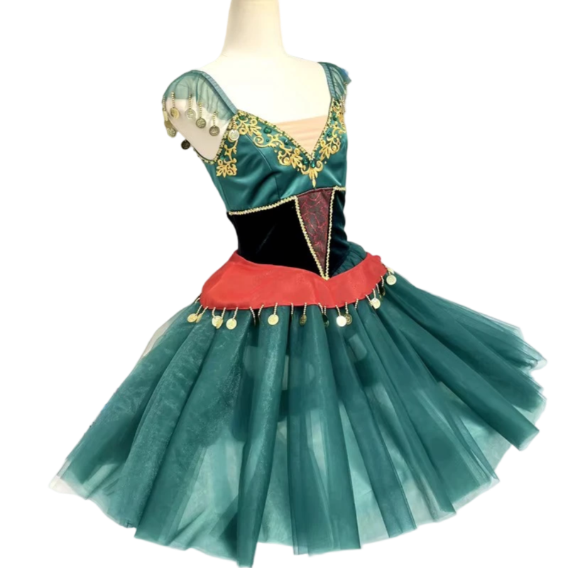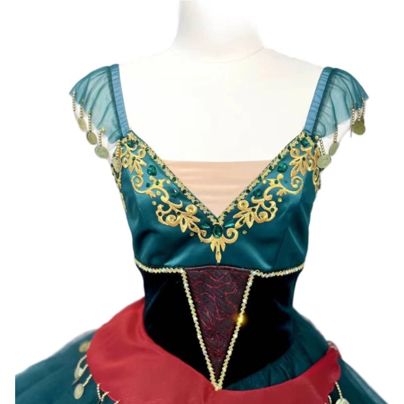 The knee length tutu skirt is deep green to match the bodice, and embellished with a red scarf sewn around the waist. Golden coins decorate the scarf, according to the gypsy style of the dress.