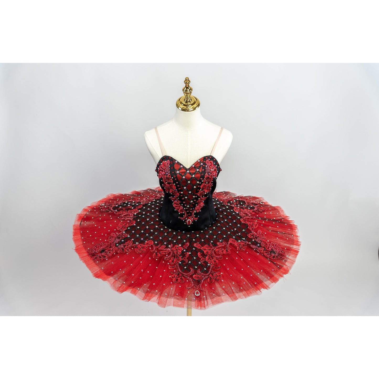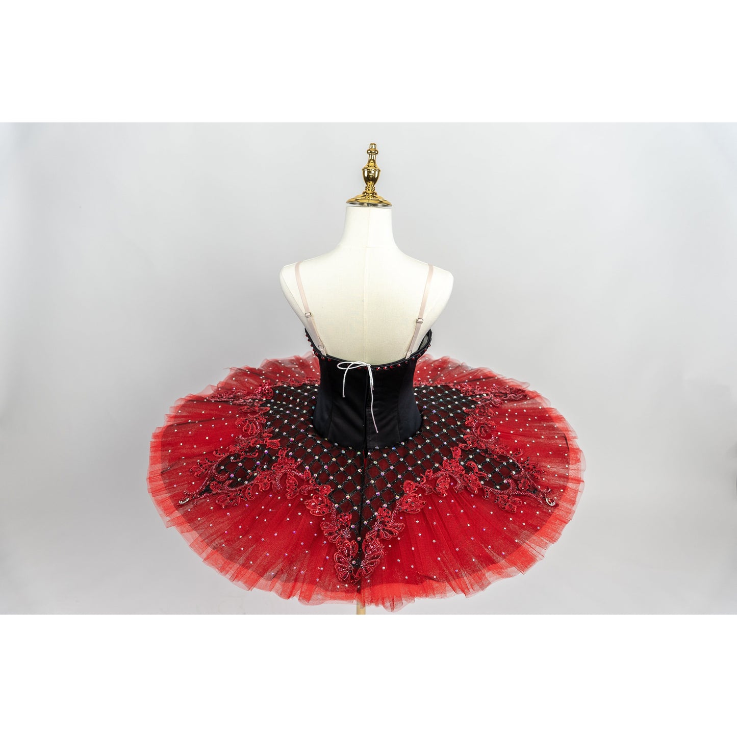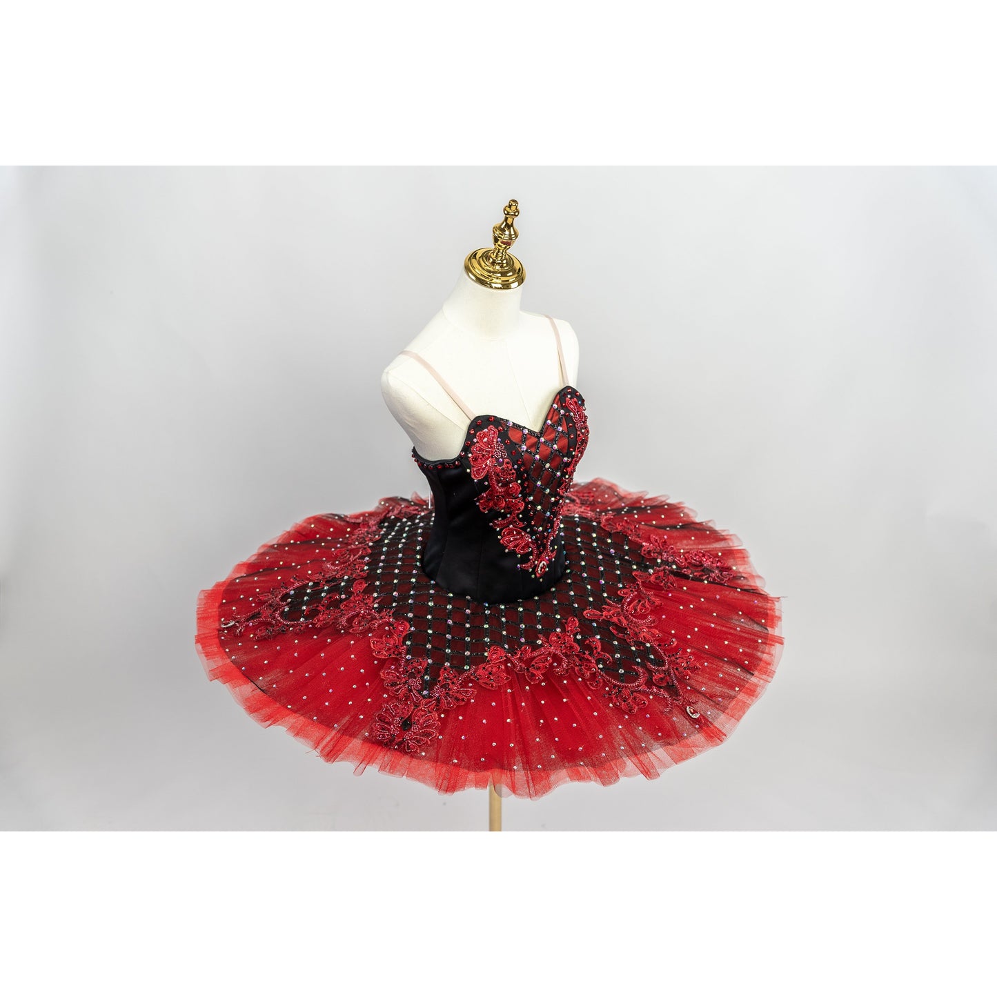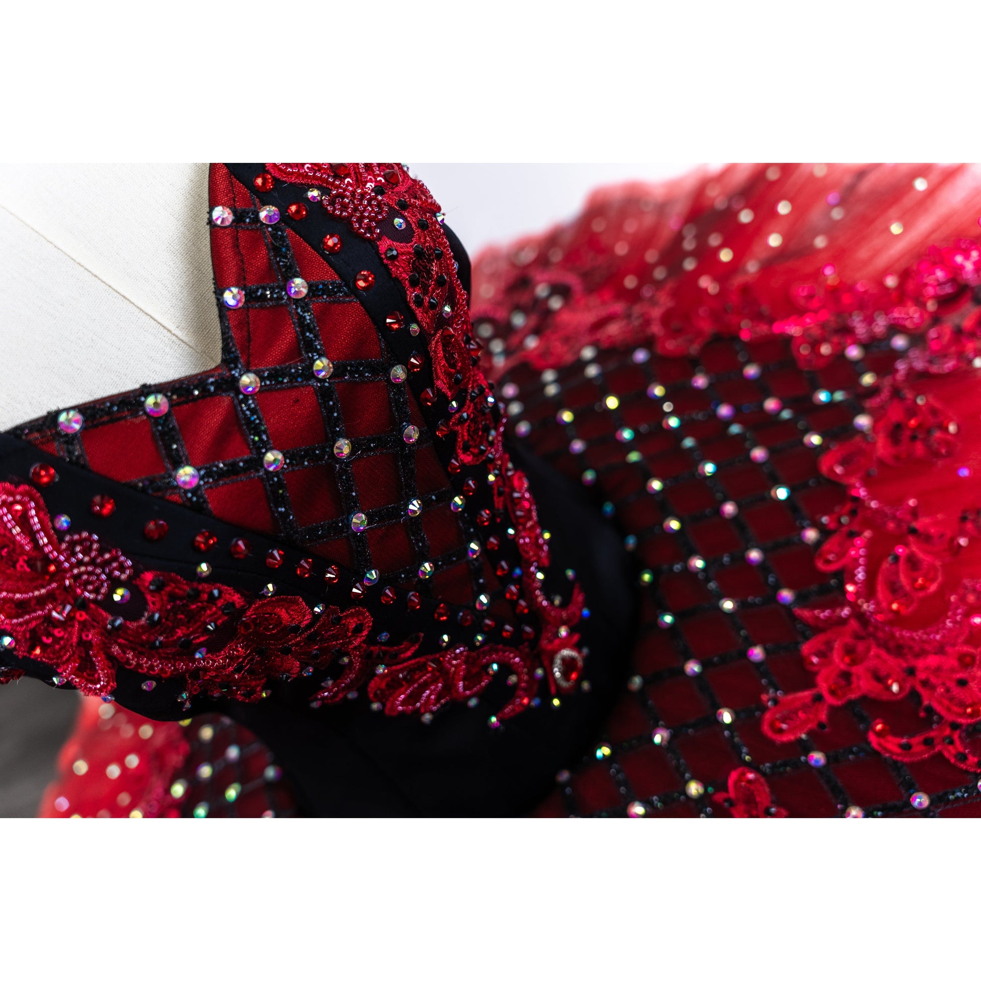 The 10 -layers, pancake red tutu skirt features a deeper red and black overlay, and is richly decorated with black trims, red appliques and sparkles.