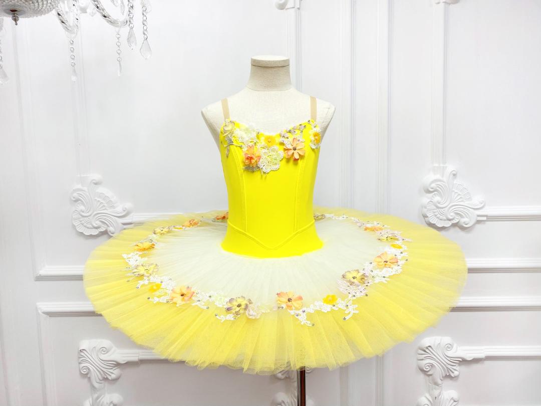 This bright yellow costume features a lycra bodice, a charming round neck decorated with white flower appliques.