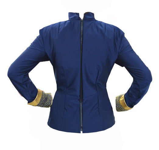 This blue male vest is made professionally using blue fabric with red and gold decorations, golden buttons, golden decorations on the wrists and shoulders, and a blue belt.