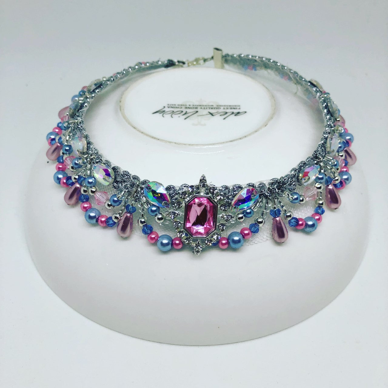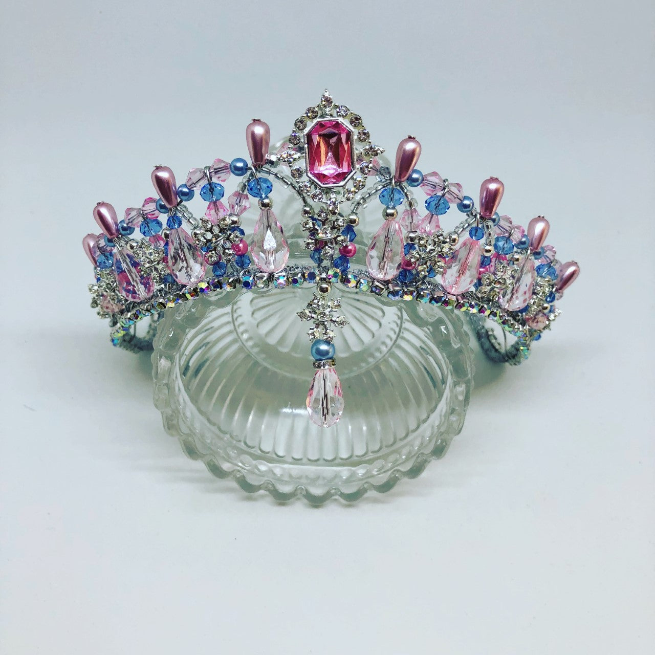 Entirely hand made on a silver frame, this crown type tiara (Katiusha), features pink and pale blue beads, pink pearls and a central, pink square crystal.