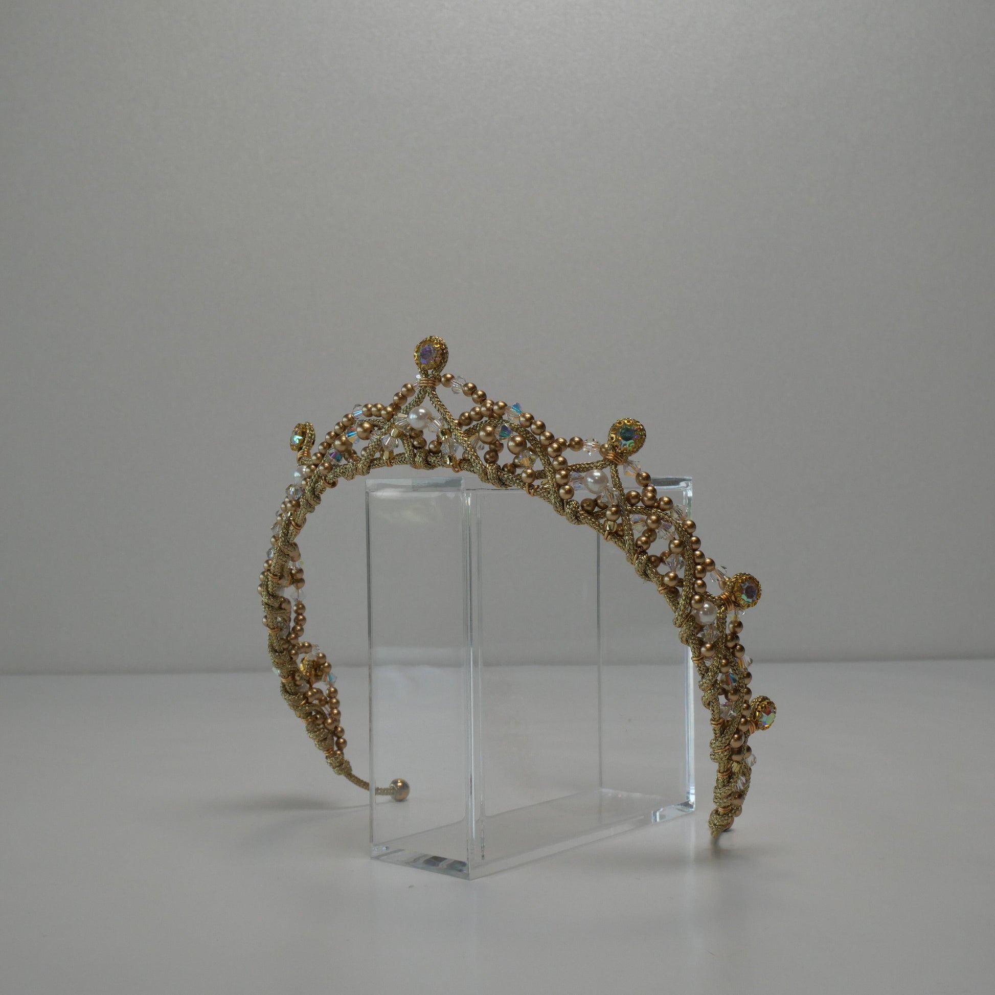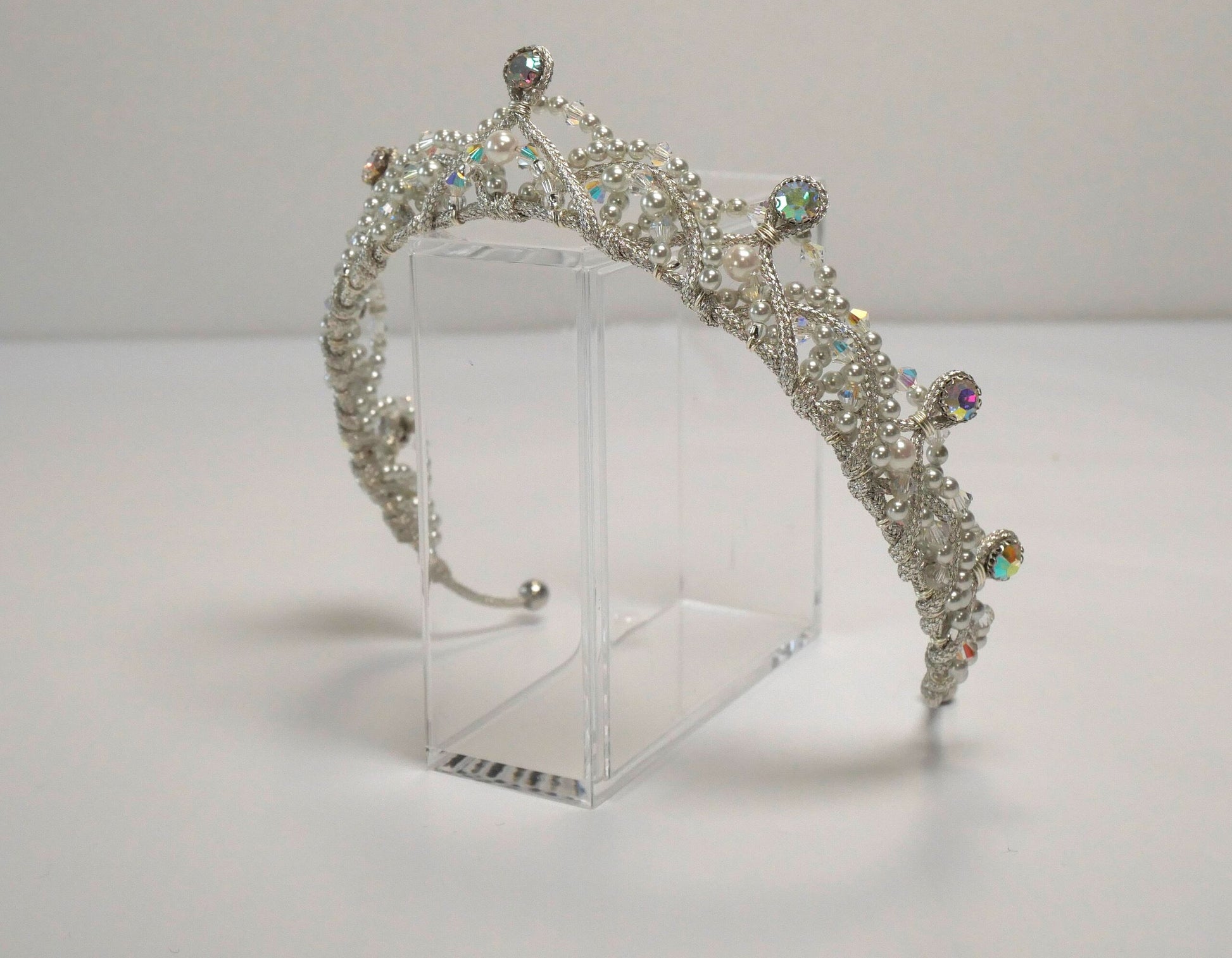 A very elegant headpiece created for the role of the Queen of the Dryads in the ballet Don Quixote. Entirely hand crafted, this crown-type tiara is available both with silver and golden frame, Swarovski crystals, silver and white pearls.