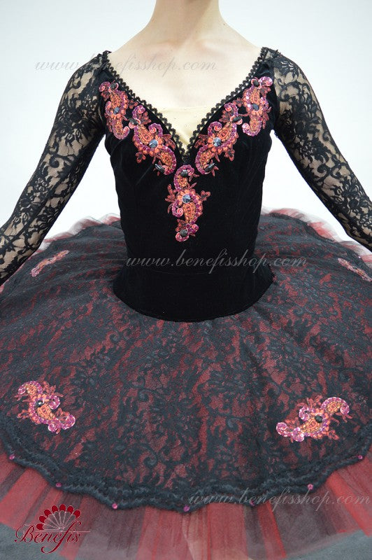 The bodice is made of elastic velvet, entirely decorated with sequins and trims, and features a flesh-colored insert on the chest. The bodice has two rows of hooks and eyes. The elegant look of this stage costume is emphasized by the black lace long sleeves.