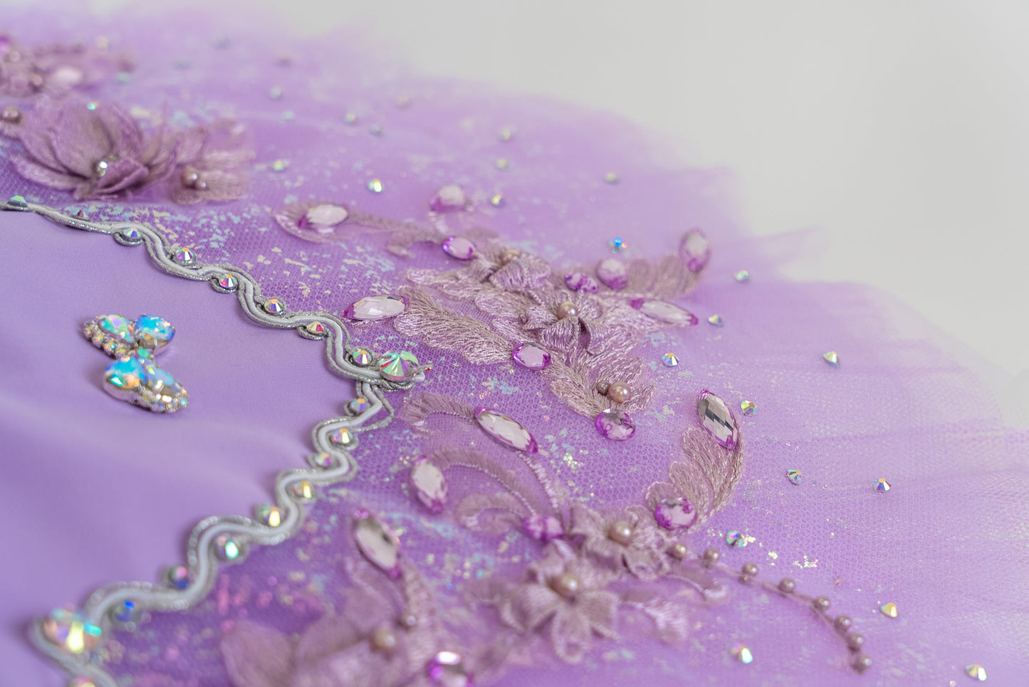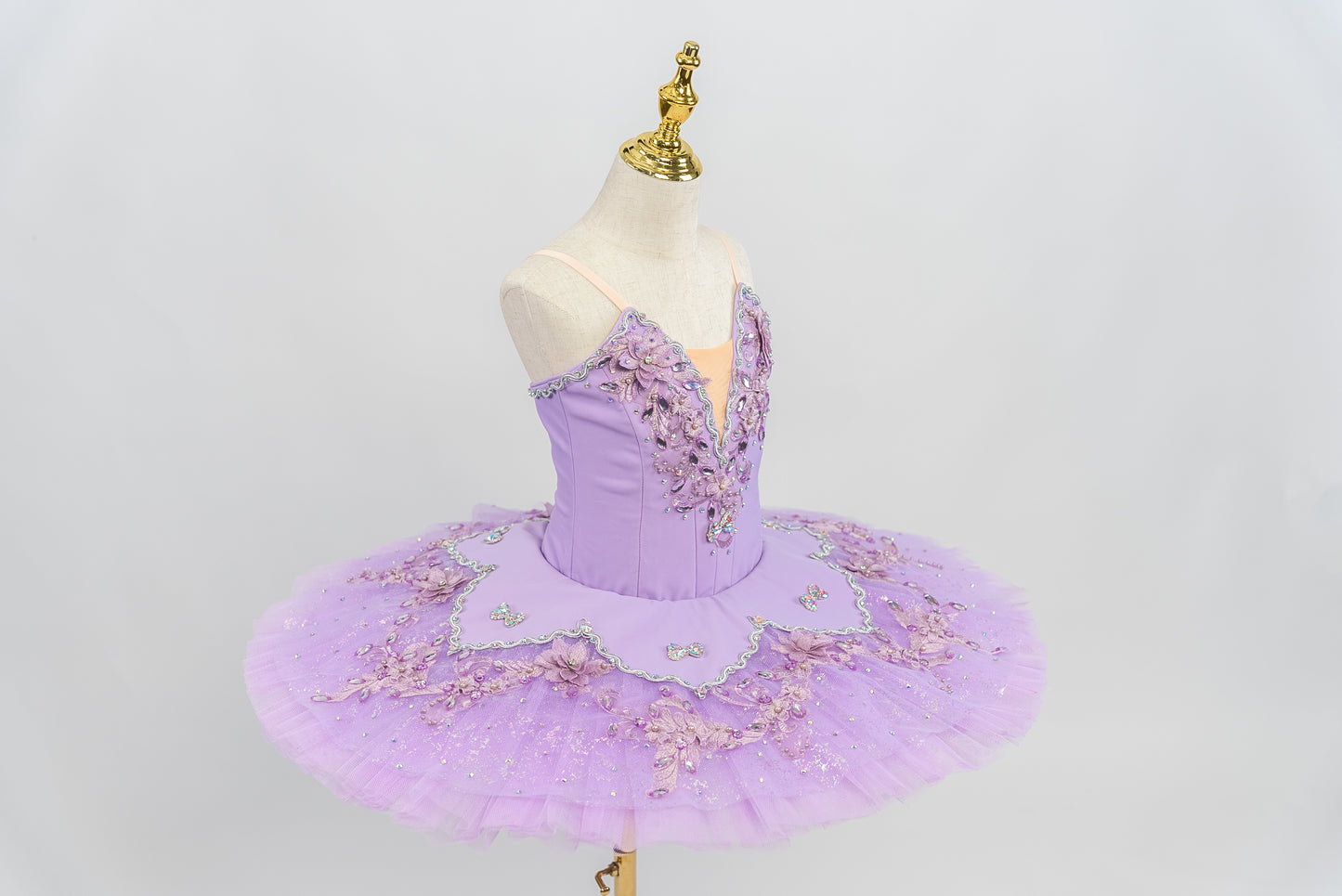 This ballet costume features a deep V neck with nude insert, and rich lilac appliques and sparkles. The lilac pancake tutu skirt is also decorated with a lilac, flower-shaped tutu skirt, and rich lilac appliques and crystals.