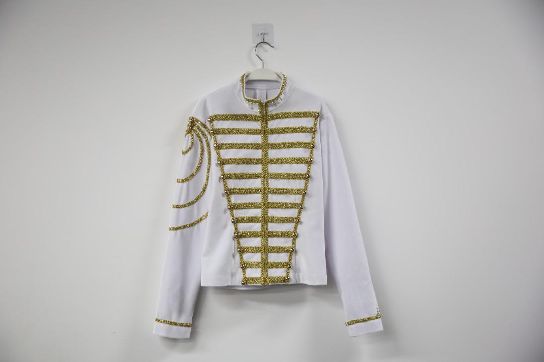 This white, long sleeved jacket features a high neck and rich gold decoration on the front, as well as on the sleeves and hand cuffs.