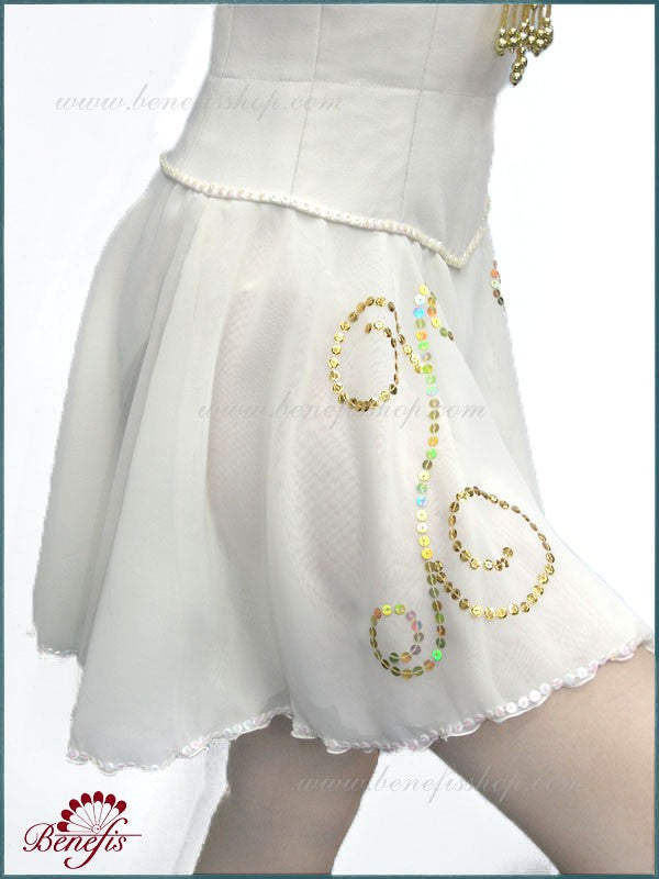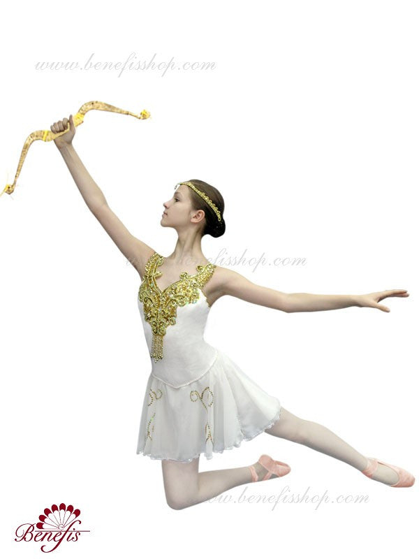 The whole décor is concentrated on the bodice. The costume is richly embellished with beads, sparkles, applications, long glass beads. The skirt is embroidered with sparkles in the shape of curved semicircular patterns. This costume would perfectly suit for Diana variation in “Diana and Acteon” ballet.