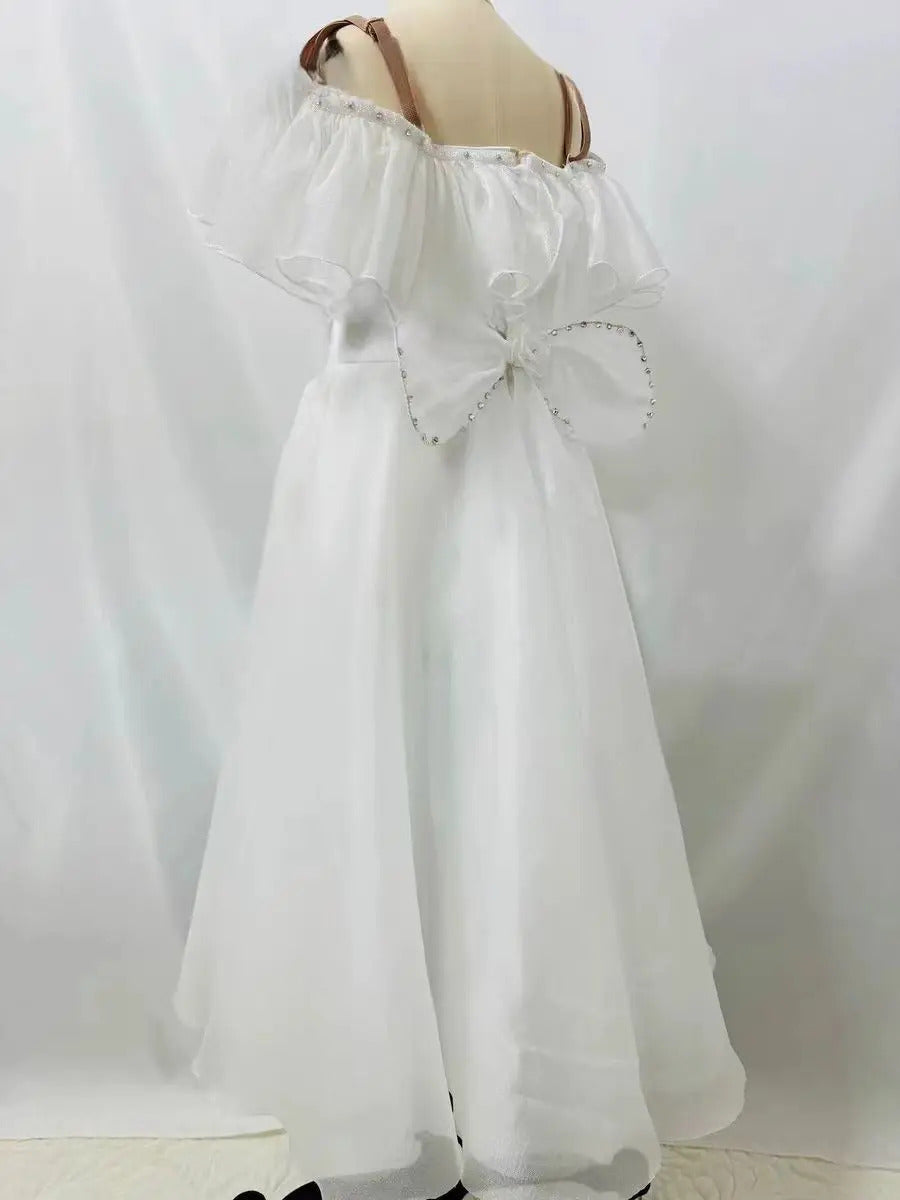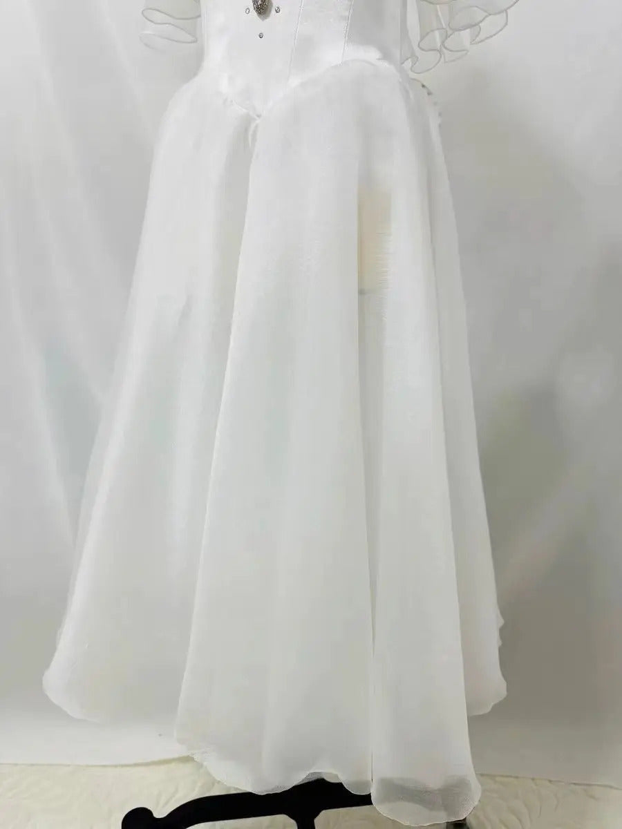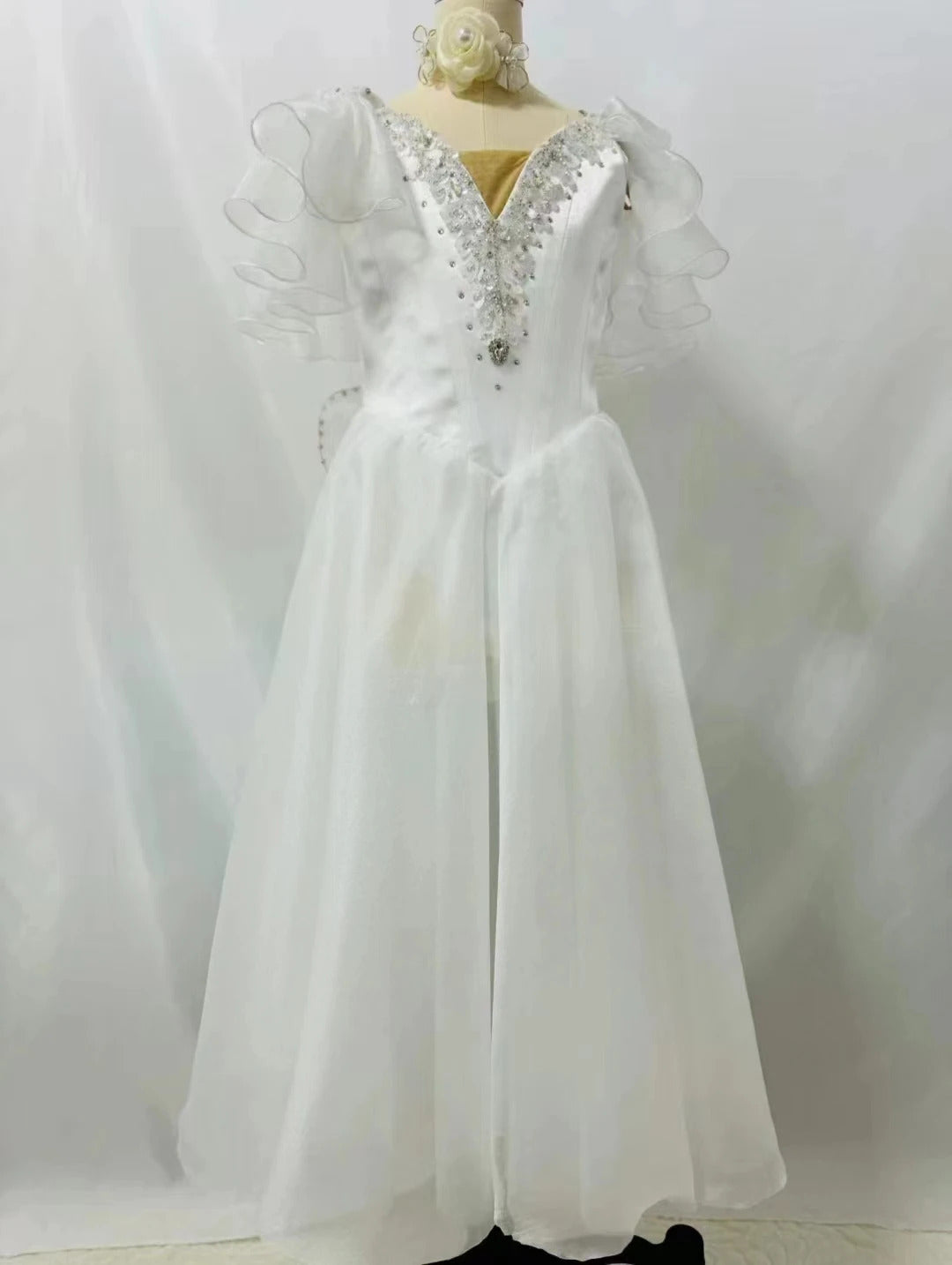 Romantic length white chiffon tutu skirt, and wings attached to the back of the costume.
