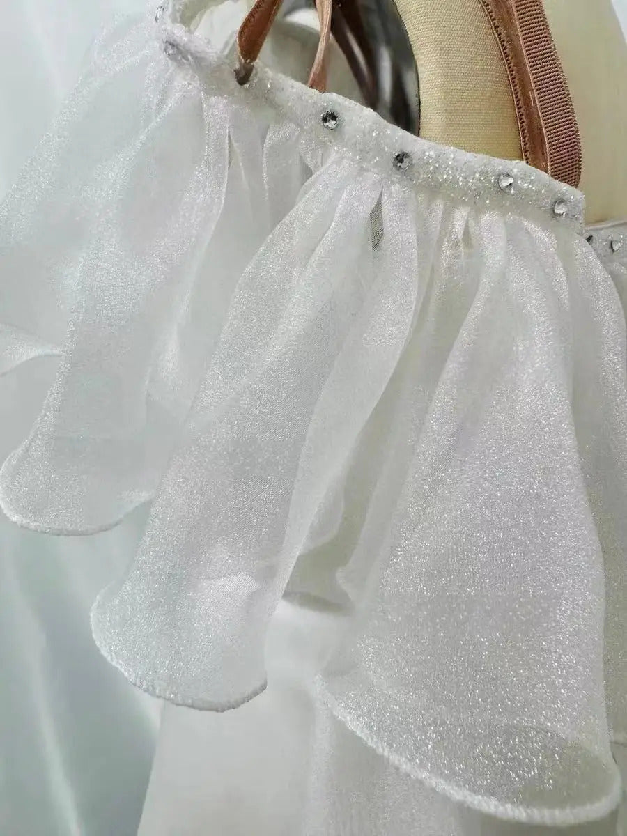 White, V-shaped satin bodice with nude insert and hooks and eyes closure. Silver decoration with appliques and crystals. Organza ruffled sleeves are sewn on the nude straps.