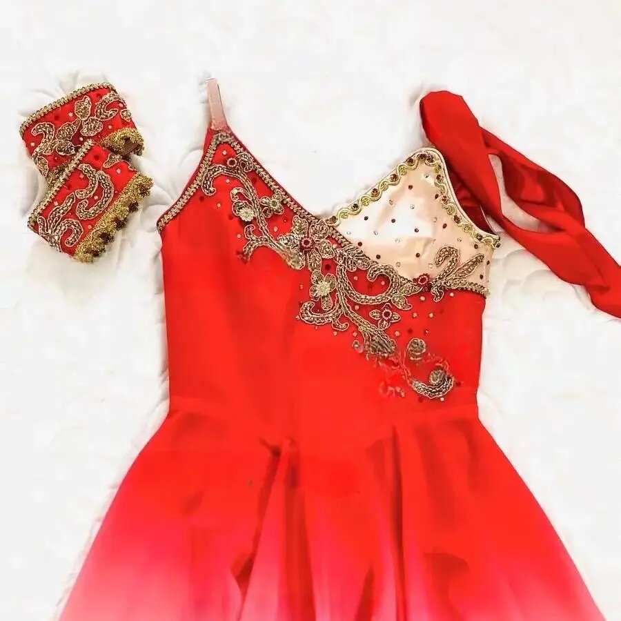 Satin red bodice featuring on side of the chest in bright gold satin. Rich gold appliques, rhinestones and sequins, as well as a red scarf on one of the shoulders, make this costume unique.