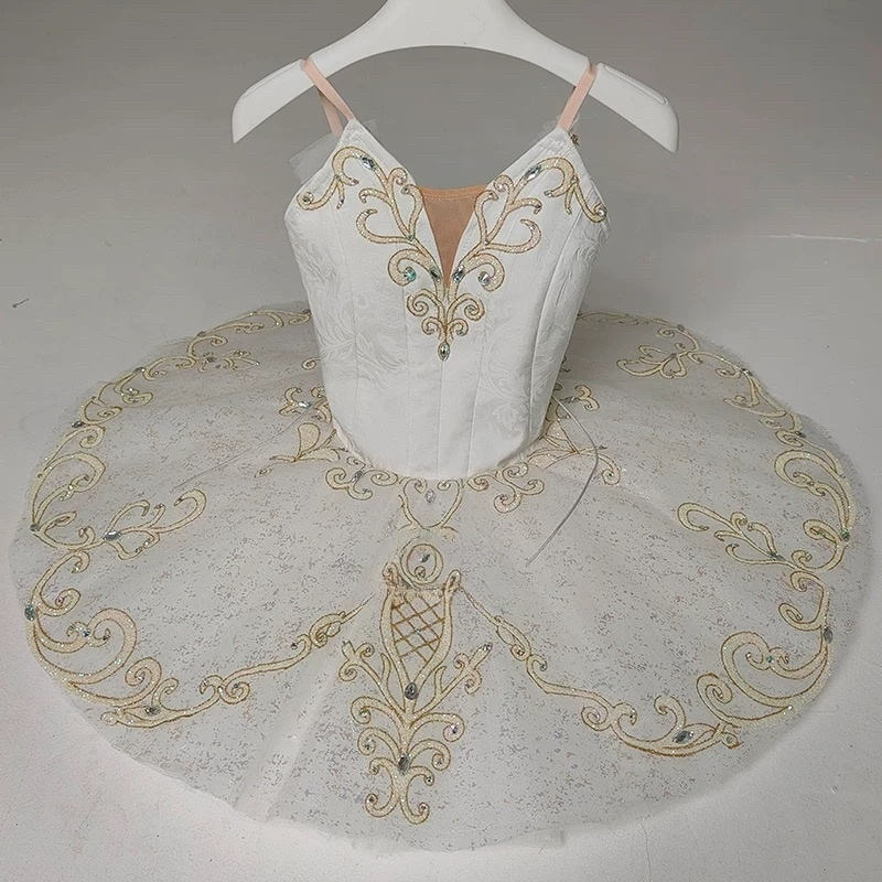Cap tulle sleeves are attached to the nude straps. The pancake tutu skirt is as rich as a real princess' gown. The 12 layers of tulle are white, featuring a top layer made of glittery tulle. Decorations are made with gold appliques and crystals. The design of this tutu is unique and will satisfy the most sophisticated ballerinas.