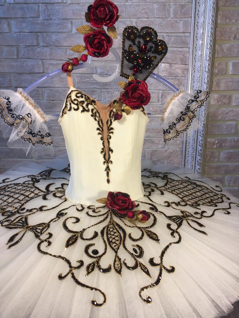 Paquita professional Russian tutu, entirely hand made and decorated. The bodice is made of special semi stretchy fabric, and features a deep V cut in the front, with nude insert. The decoration is made with gold appliques, and one red rose is sewn on one side of the chest.