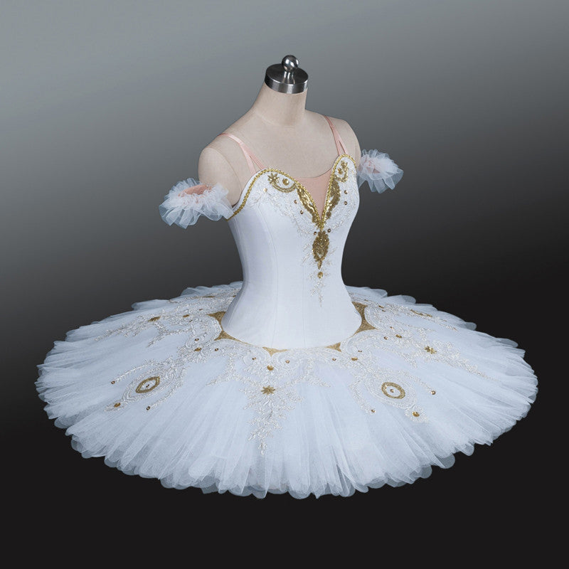 This professional tutu features a white bodice with a nude insert and rich gold decorations. The bodice fastens in the back with a double row of hooks and eyes. Arm bands are also included.