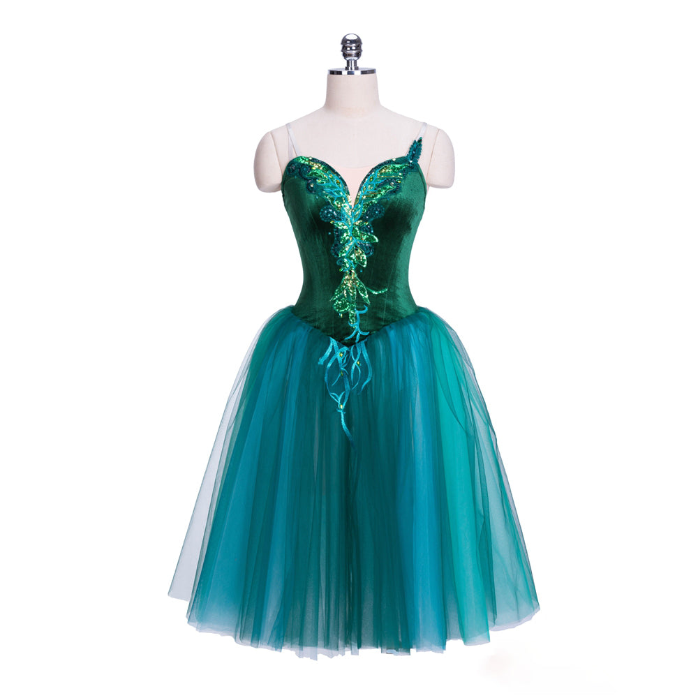This professional tutu features a deep green velvet bodice with very rich shiny decoration. Appliques, sequins, crystals in all shades of green.