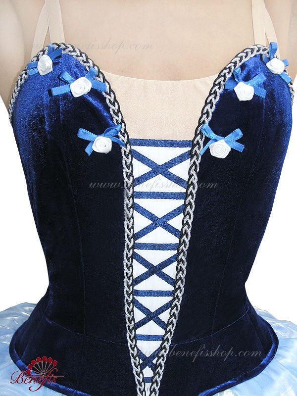 It is a professional stage costume, which consists of a velvet bodice with decorative lacing in front and a fluffy skirt. The upper layer is made of white silk.