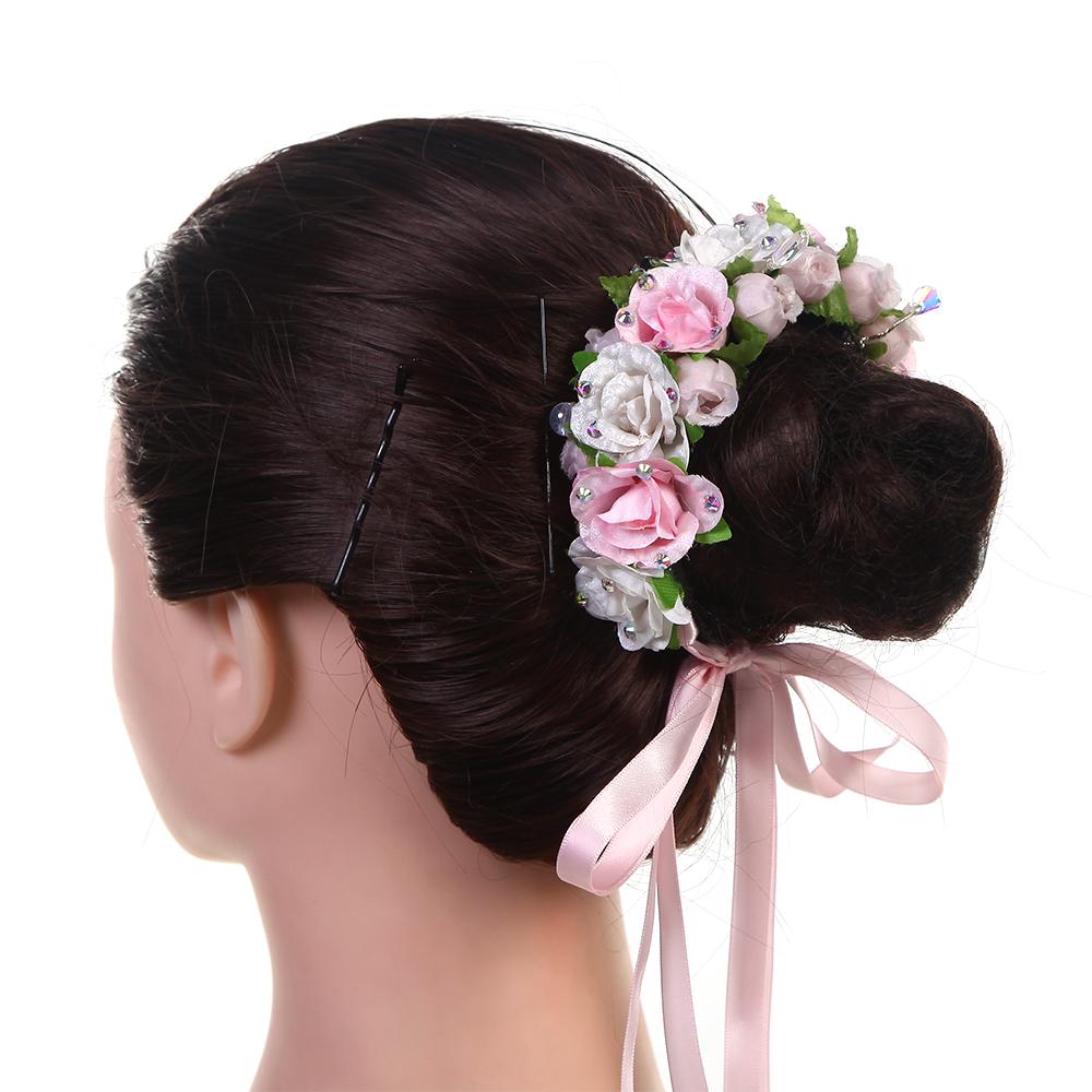 A lovely pink peasant tiara with pink and white silk flowers. Pink satin ribbons decorate this delicate headpiece.