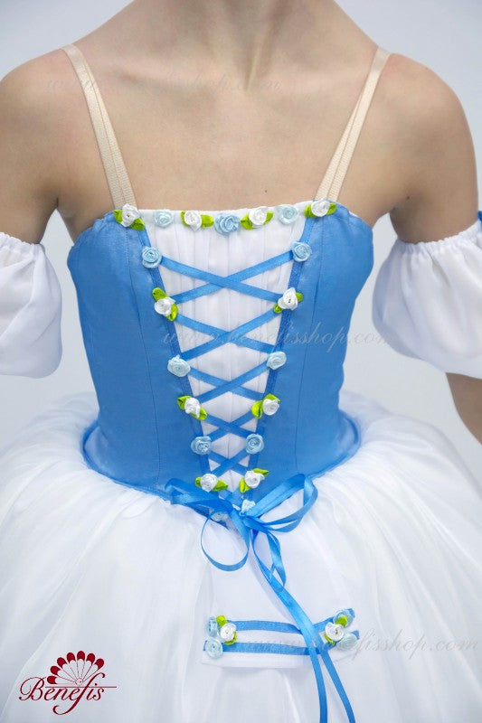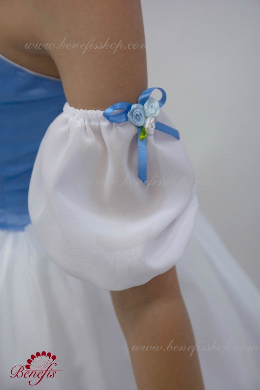Sky blue professional bodice fastening in the back with a double row of hooks and eyes, with white undershirt insert, sky blue laced pattern, flower appliques and white chiffon arm puffs.