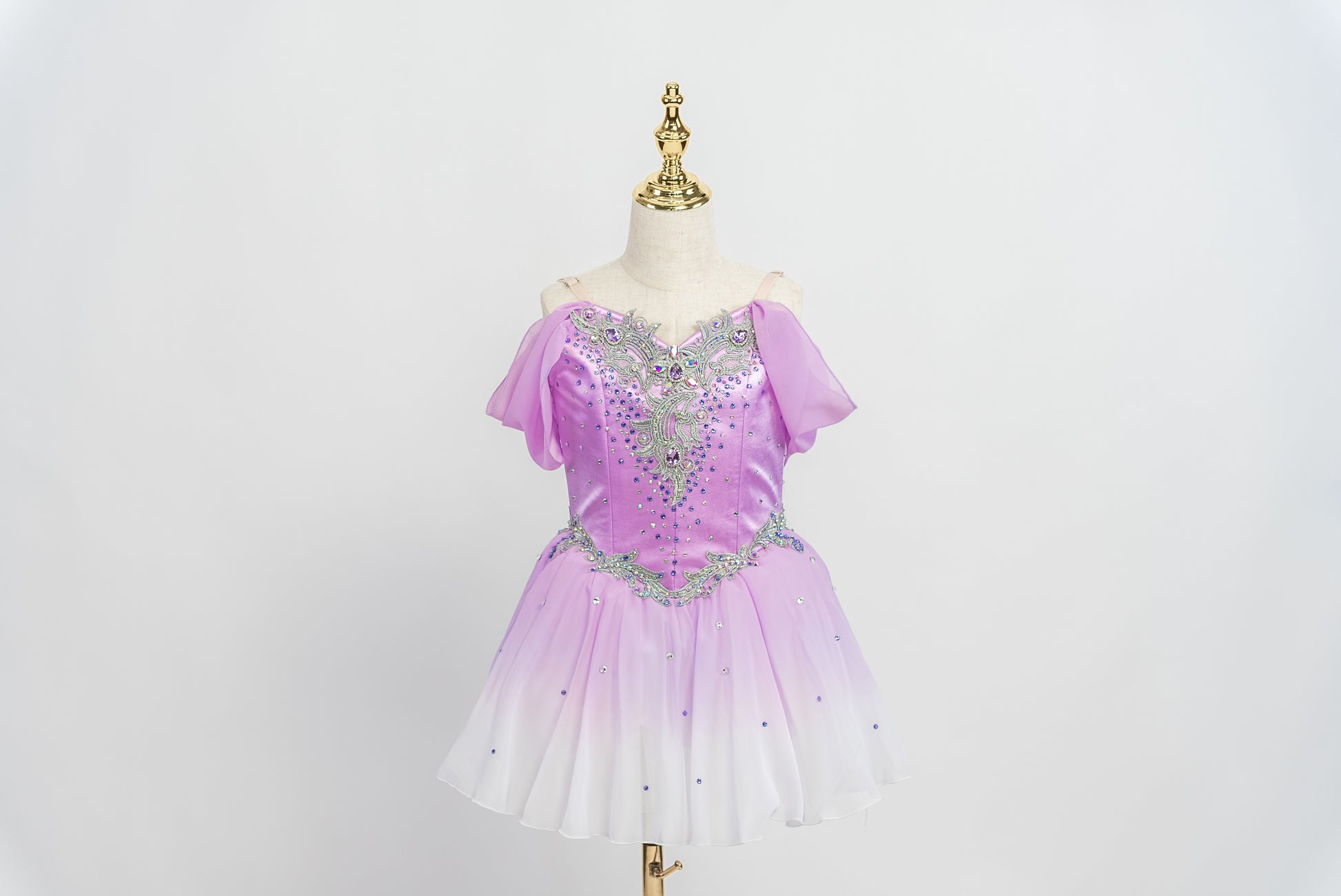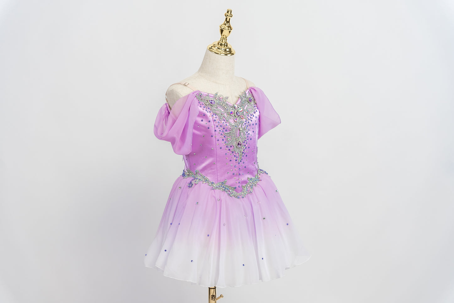 The bodice is made with high quality lilac shiny satin, with thin spaghetti straps and chiffon sleeves attached. The bodice is richly decorated with silver appliques and lilac/violet crystals and sparkles.