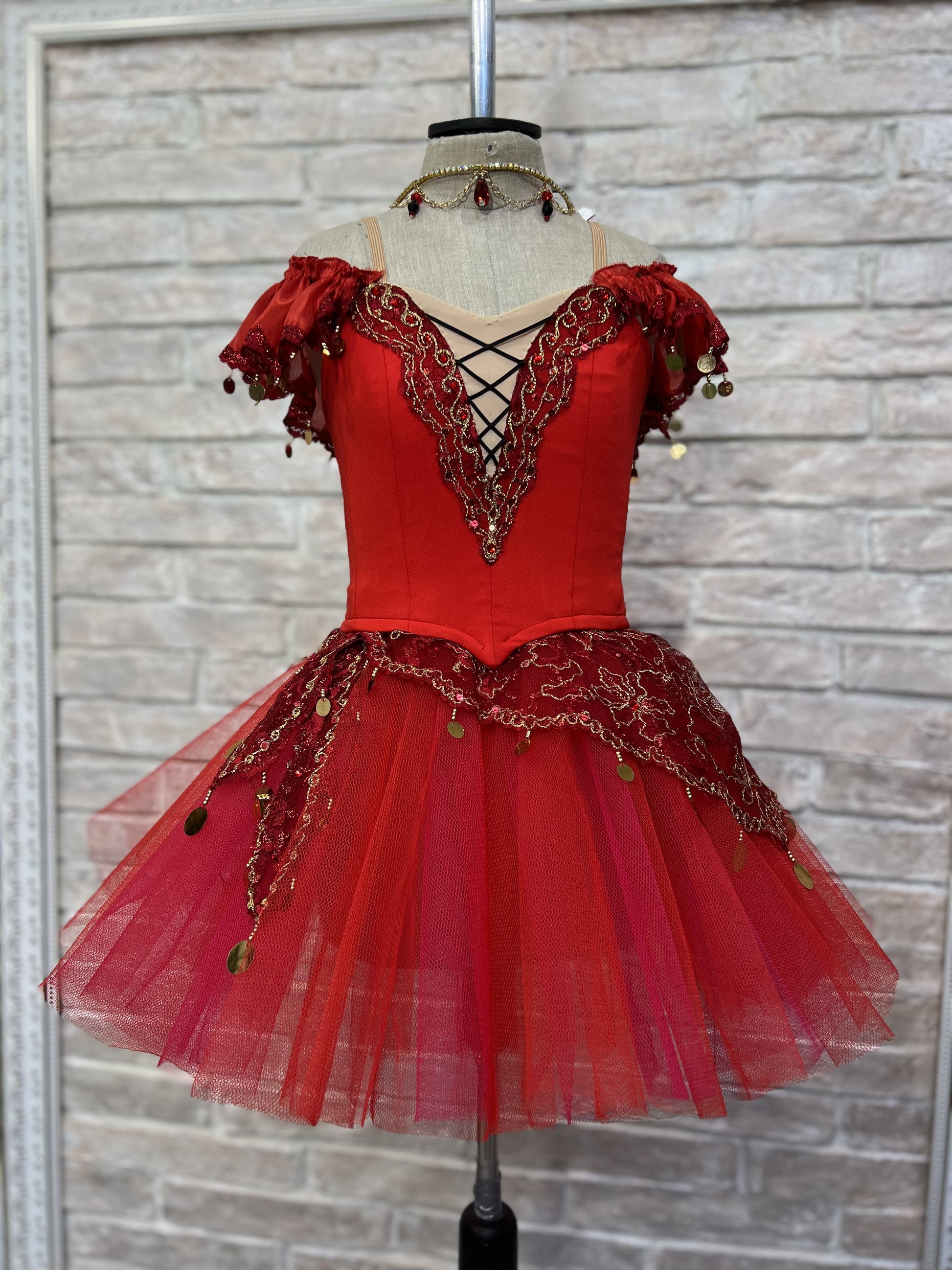 La jupe tutu est confectionnée en tulle rouge de haute qualité et comporte une écharpe rouge et dorée attachée sur un côté de la taille.